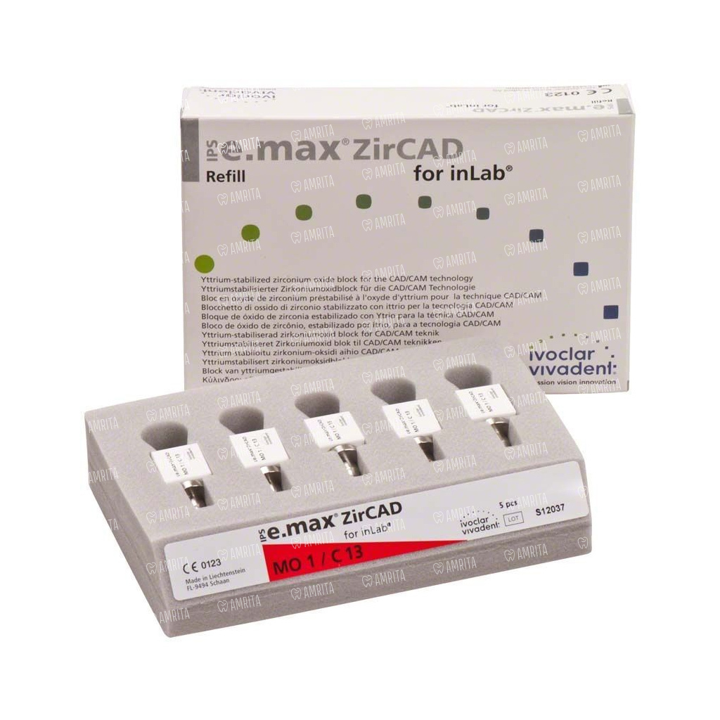 Блоки из оксида циркония IPS e.max ZirCAD inLab С13 MO фрезеруются в системе inLab, благодаря высокой прочности после спекания (>900 МПа) из них можно изготавливать протезы на боковые зубы. На каркасы напрессовывается материал IPS e.max ZirPress или наносится облицовочный материал IPS e.max Ceram. Выпускаются в девяти размерах и трех цветах.