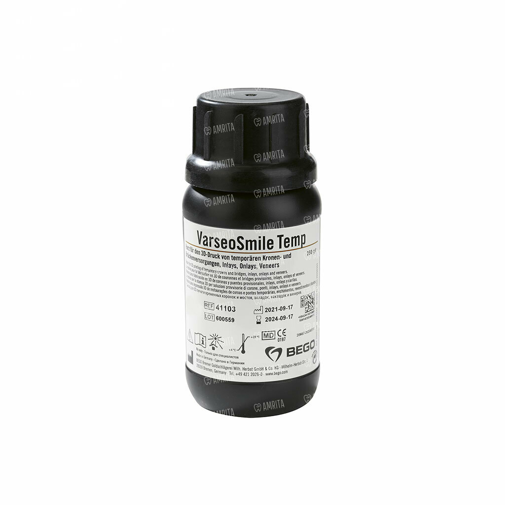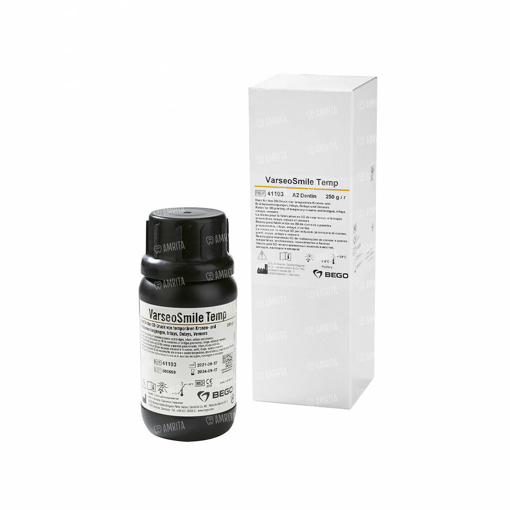 Материал для 3D-печати VarseoSmile Temp от бренда Bego — это биосовместимый полимер, разработанный для изготовления временных коронок, мостовидных протезов, вкладок, накладок и виниров. Этот материал сочетает в себе высокую прочность, превосходную стабильность размеров и естественную эстетику, что делает его идеальным решением для создания надежных и функциональных временных реставраций. Является медицинским изделием класса IIa.