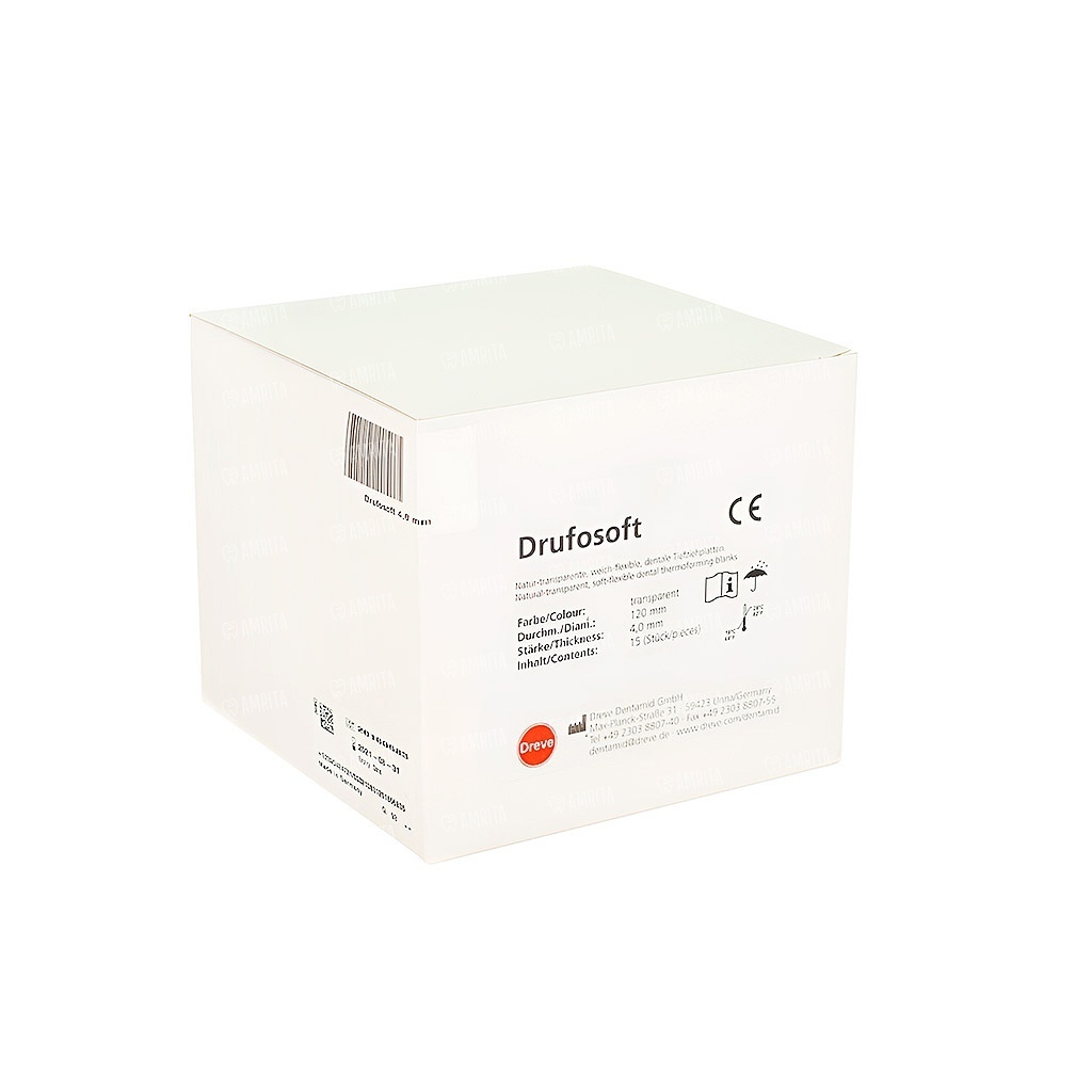 Пластины DRUFOSOFT — это профессиональный мягко-эластичный термоформовочный материал максимальной толщины (5,0 мм) на основе этиленвинилацетата (EVA), разработанный компанией Dreve. Данная модификация является самой мощной в линейке и обладает полной прозрачностью. Она предназначена для изготовления профессиональных защитных капп для жестких контактных видов спорта (хоккей, бокс, единоборства), а также массивных позиционеров. Стандартный диаметр 120 мм обеспечивает совместимость с большинством типов вакуумного и прессо-формовочного оборудования. В упаковке поставляется 15 пластин.