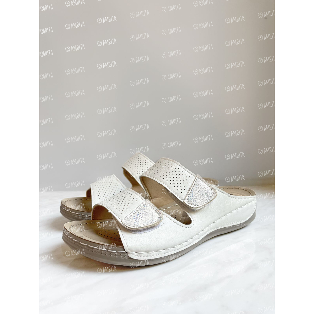 Женские пантолеты от производителя Start выполнены из искусственной кожи белого цвета с перфорацией. Объем верха стопы регулируется двумя застежками велькро (липучки). Подошва обуви изготовлена из прочного противоскользящего полиуретана, надежно скрепляет все компоненты и делает походку уверенной.