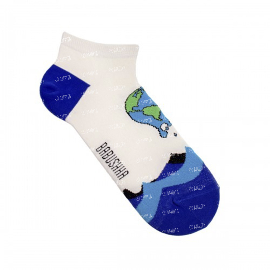 Цветные носки Глобальное потепление Babushka. Земной шар тает и капает в море, катастрофа неизбежна. Эти яркие носки сделаны из отменного гребенного хлопка. Разработка и производство — Россия.