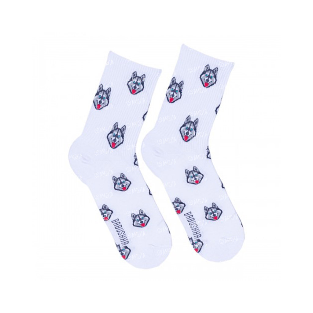 Спортивные носки с хаски Babushka. Сделаны из натурального хлопка высокого качества. Пятка и мысок усилены, что продлевает срок службы носка.