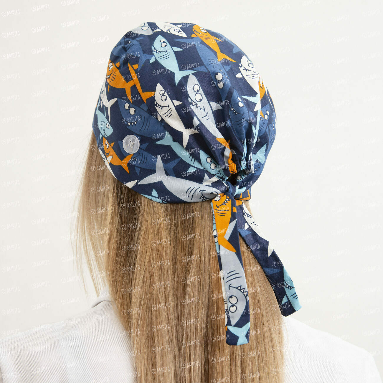 Медицинская шапочка облегающей формы имеет анатомическую посадку, которая обеспечивает полное покрытие головы и надежно удерживает волосы. Эластичная резинка сзади и завязки, позволяют индивидуально регулировать размер головного убора, а пуговицы по бокам удерживают маску, избавляя уши от давления. На внутренней стороне лобной части есть махровая вставка.