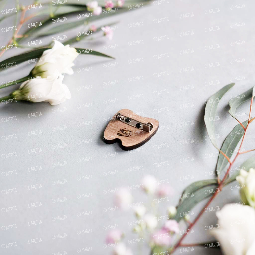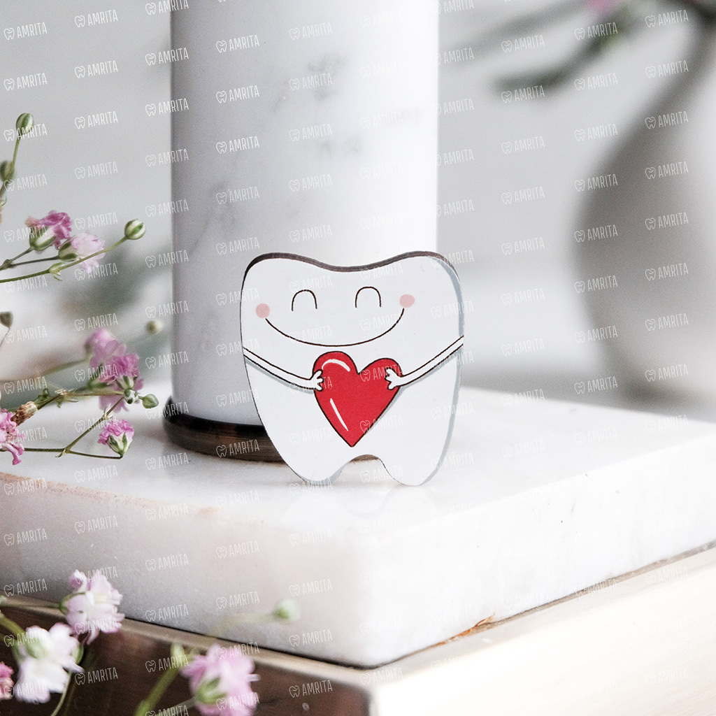 Подарок для врача стоматолога. Деревянный значок ручной работы «Зуб с сердцем». Раскрашен вручную, покрыт защитным слоем лака. Крепление сзади — булавка.