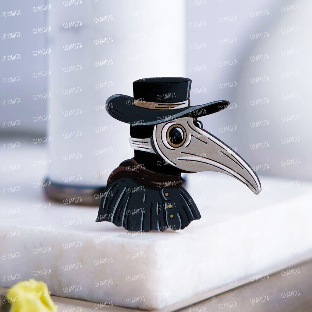 Деревянная брошь "Чумной доктор" вручную расписана акриловыми красками. Сверху покрыта защитным слоем лака, чтобы краски сохраняли свой первоначальный вид. Крепится брошь на булавку, которая расположена с тыльной стороны броши.