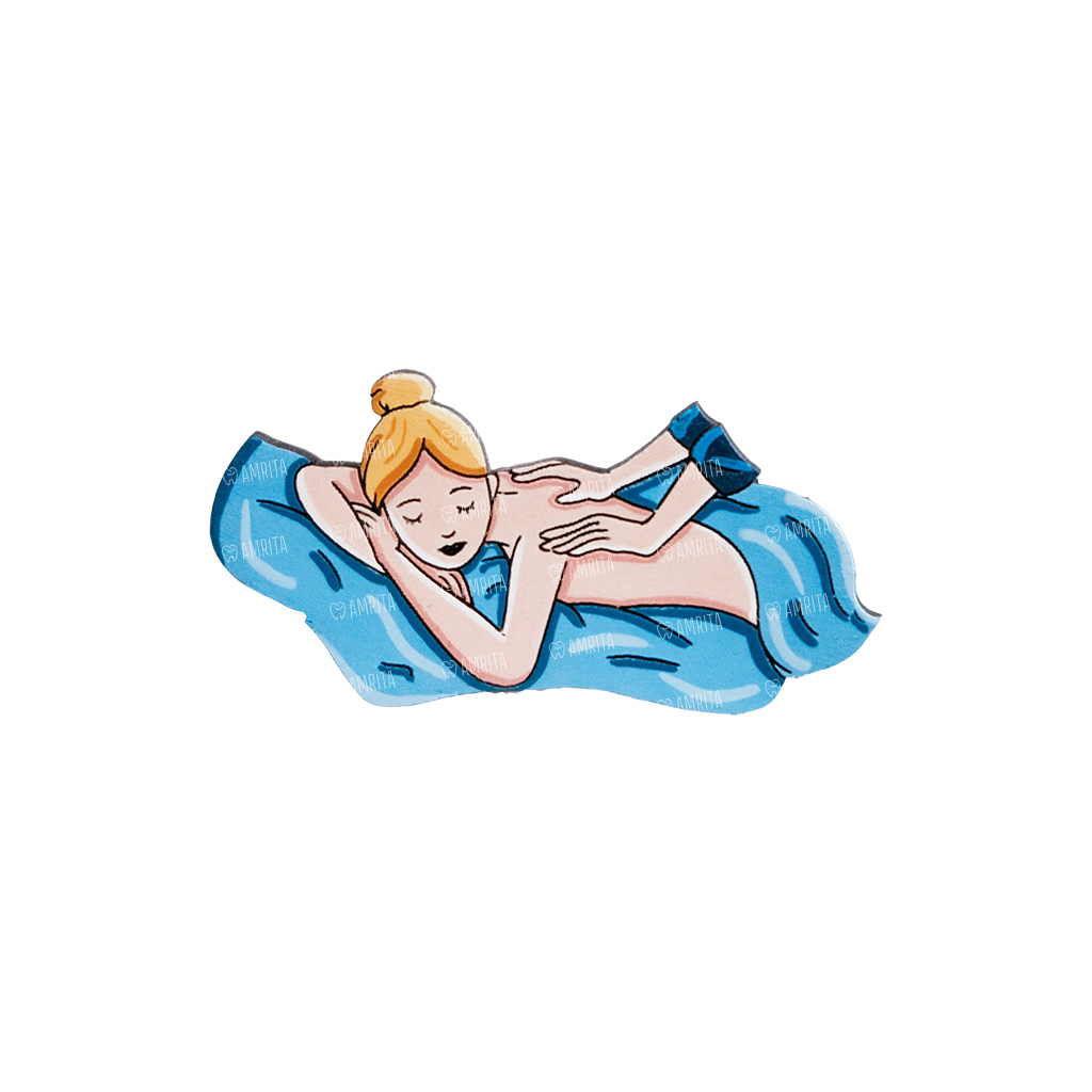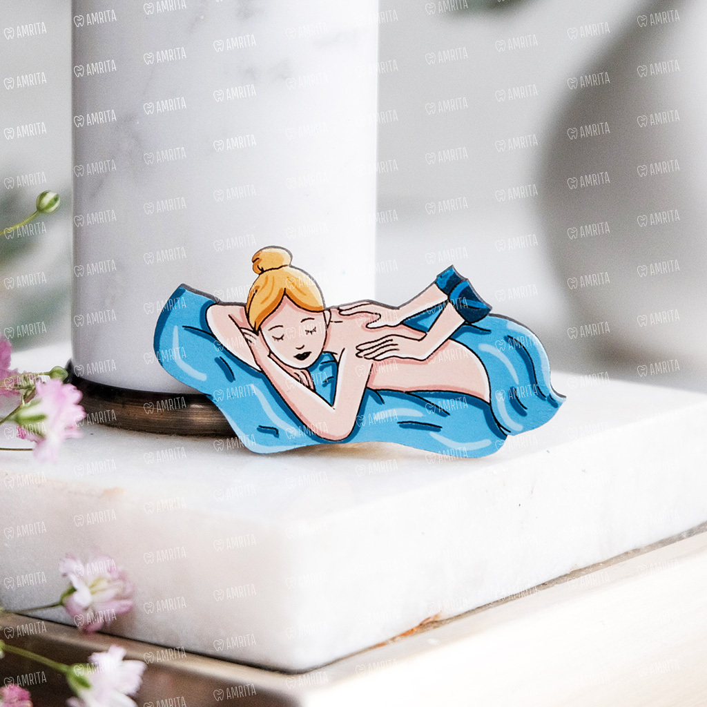 Деревянный значок для массажистов с пациенткой-блондинкой на голубом одеяле. Для тех, чьи сильные, ловкие и умелые руки невероятно управляются с болями в теле и мышечным напряжением. Ручная работа. Оригинальный дизайн. Раскрашен вручную премиальными акриловыми красками.