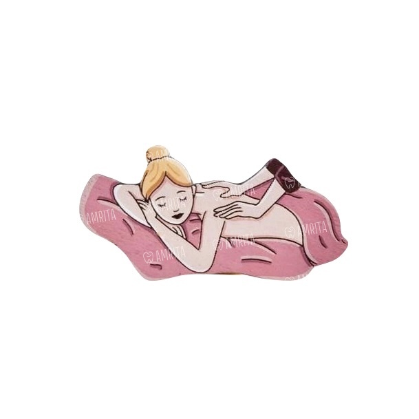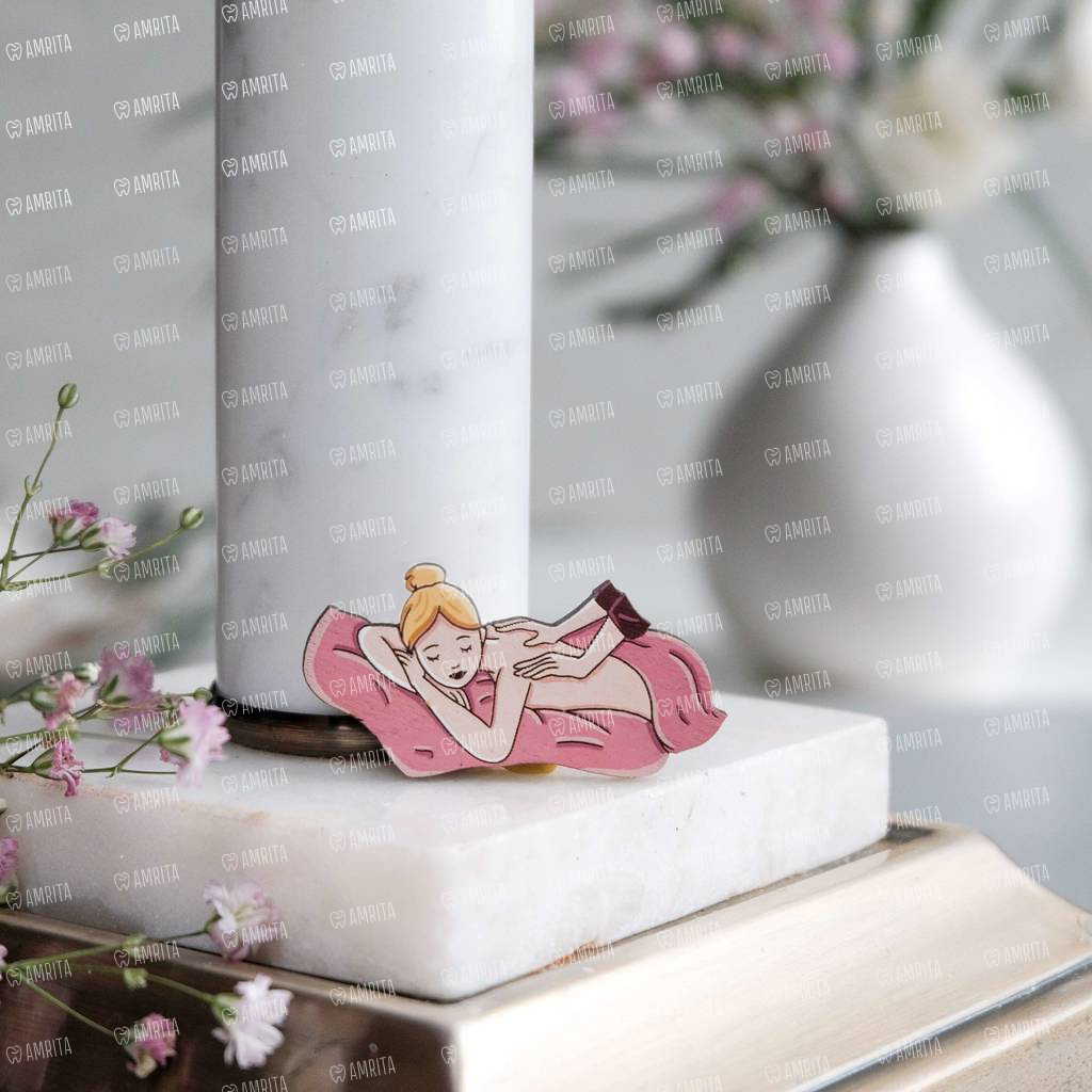Деревянный значок для массажистов с пациенткой-блондинкой на розовом одеяле. Для тех, чьи сильные, ловкие и умелые руки невероятно управляются с болями в теле и мышечным напряжением. Ручная работа. Оригинальный дизайн. Раскрашен вручную премиальными акриловыми красками.