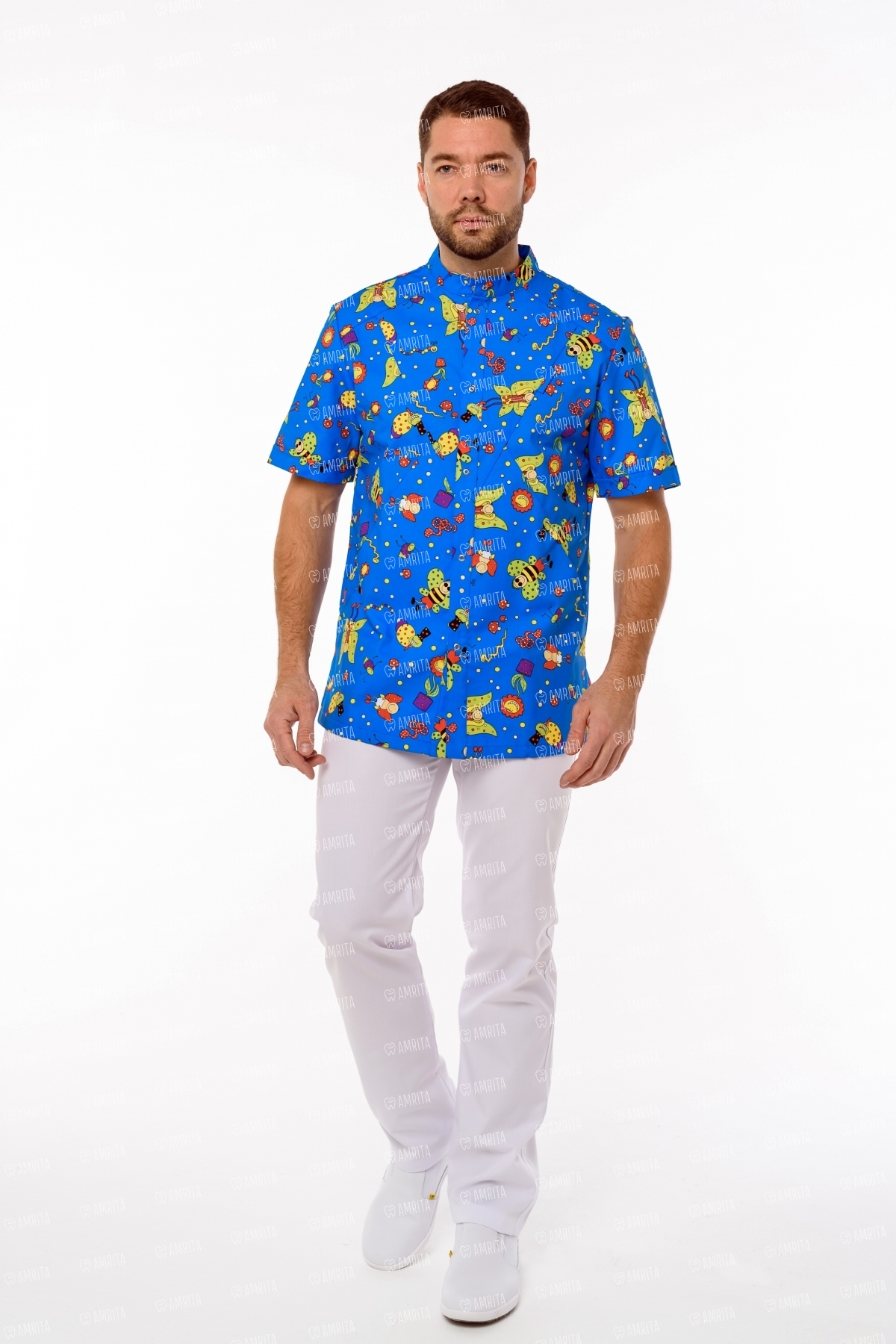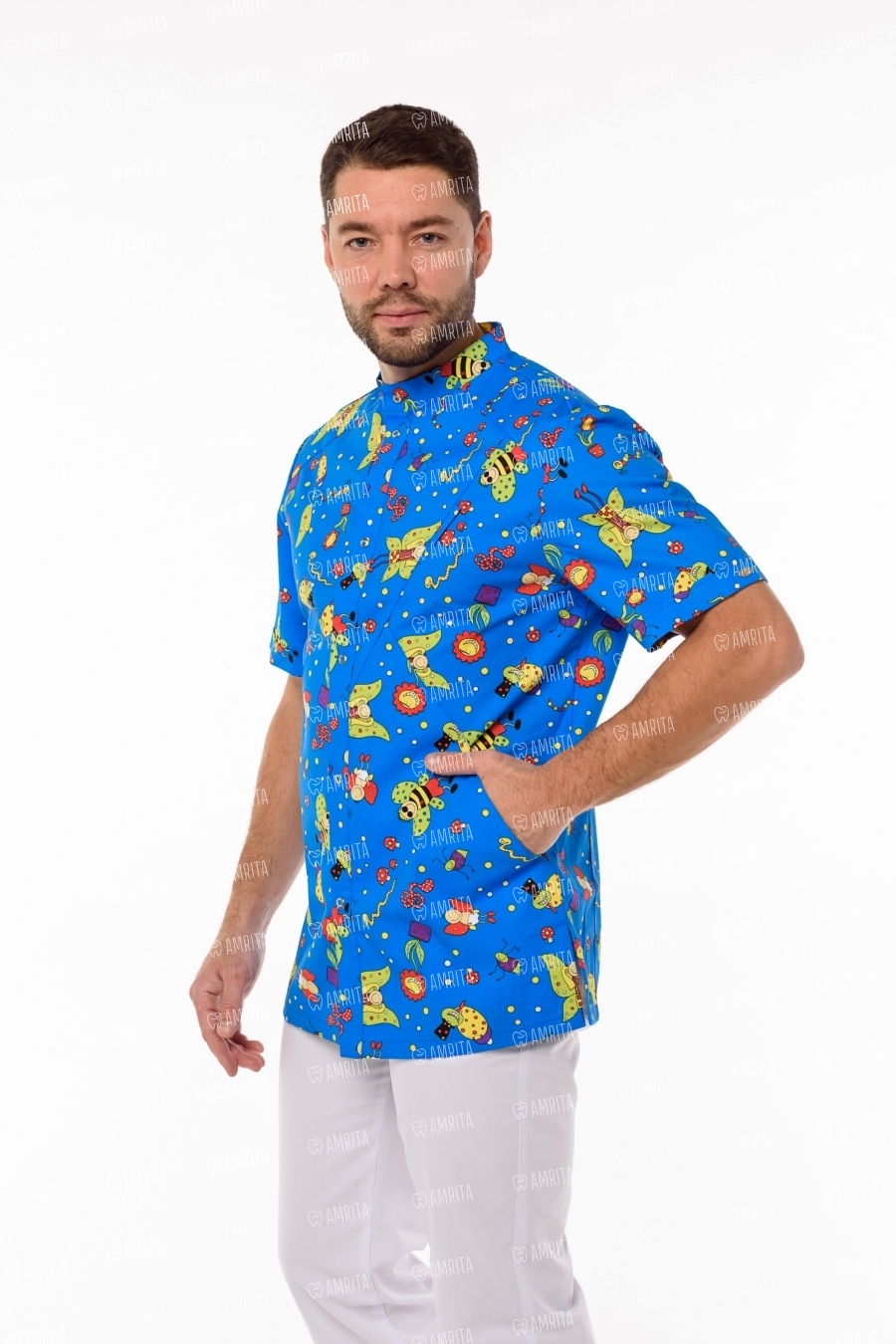 Мужская медицинская блуза с удобным коротким рукавом "Педиатр М" от бренда Доктор Стиль выполнена из ткани с оригинальным принтом. Модель имеет прямой силуэт, воротник-стойку, рациональные застежки спереди, боковые разрезы. Блузу дополняют три функциональных кармана: один нагрудный и два вместительных боковых кармана. Ткань плотная и износоустойчивая с повышенной мягкостью поверхности, прилегающей к телу.