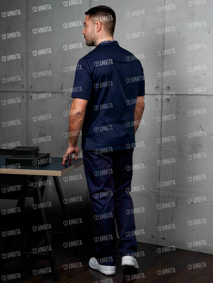 Блуза мужская медицинская "Алекс" имеет удобный короткий рукав, прямой силуэт и воротник-стойку, за счет чего комфортно садится по фигуре. Блуза Dr.Style застегивает спереди на металлические кнопки, у нее есть глубокие боковые карманы и разрезы. Ткань средней плотности, не линяет.