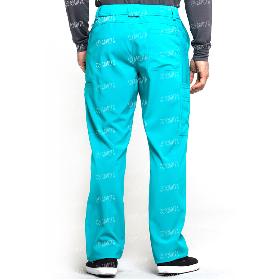 Мужские медицинские брюки Cherokee CK200A с зауженными штанинами имеют внутреннюю функциональную кулиску, эластичный пояс сзади с ребристой вязкой, пять шлевок для ремня, ширинку на молнии с застежкой на пуговицы и потайную ластовицу во внутреннем шве для дополнительного удобства. Изделие дополнено двумя передними угловыми карманами, правым двойным грузовым карманом с петлей для бейджа, левым прорезным грузовым карманом и задним накладным карманом.