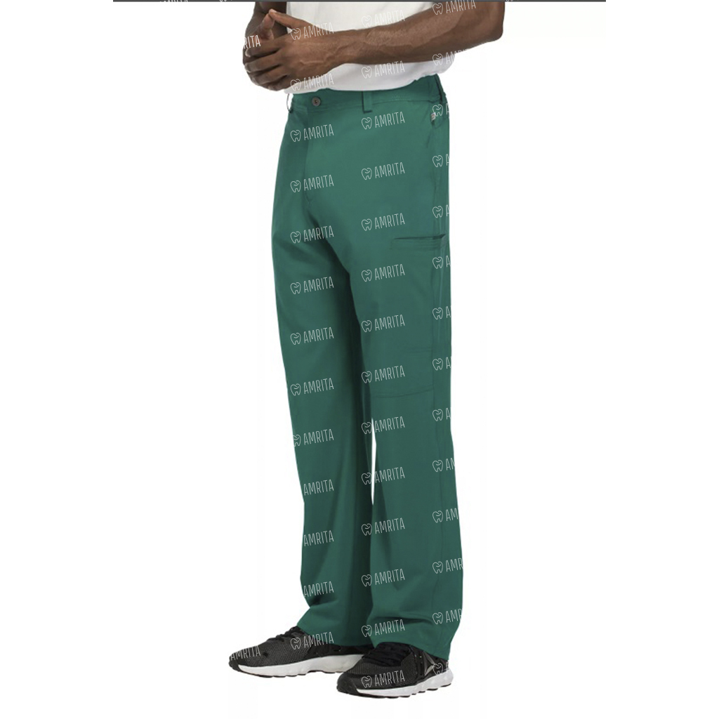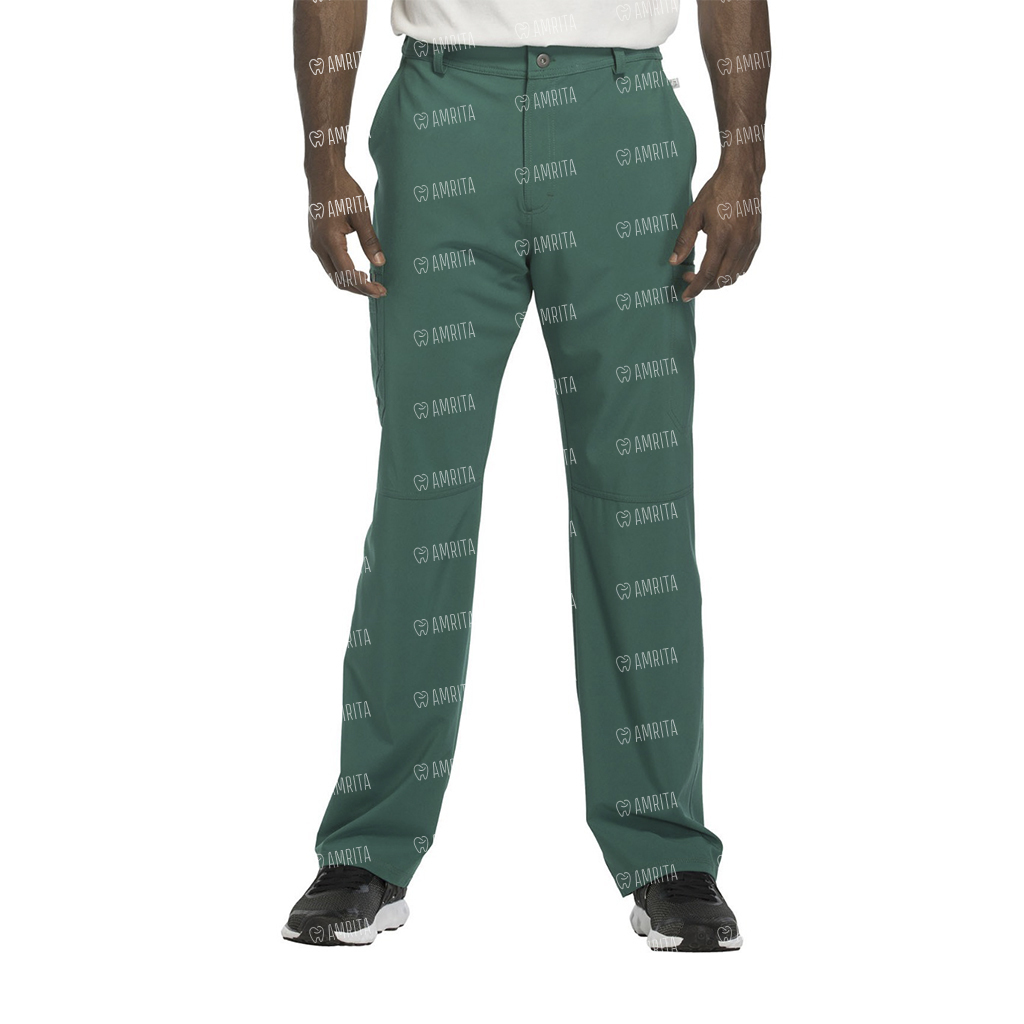 Мужские медицинские брюки Cherokee CK200A с зауженными штанинами имеют внутреннюю функциональную кулиску, эластичный пояс сзади с ребристой вязкой, пять шлевок для ремня, ширинку на молнии с застежкой на пуговицы и потайную ластовицу во внутреннем шве для дополнительного удобства. Изделие дополнено двумя передними угловыми карманами, правым двойным грузовым с петлей для бейджа, левым прорезным грузовым карманом и задним накладным карманом.