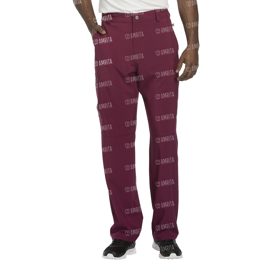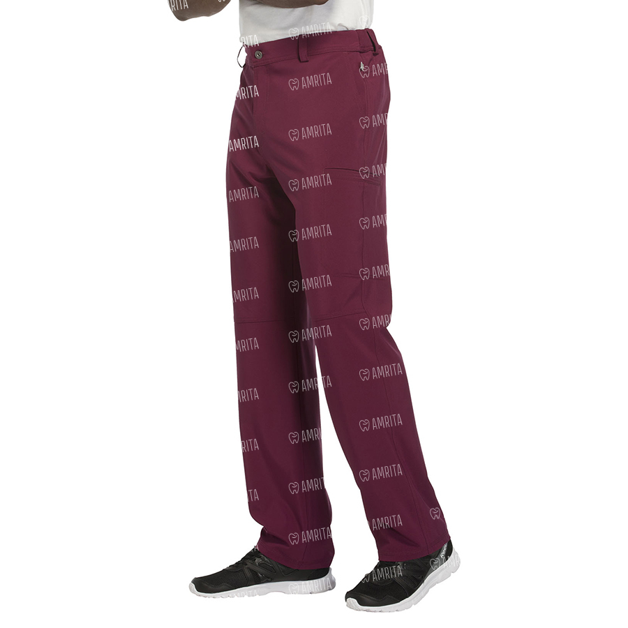 Мужские медицинские брюки Cherokee CK200A с зауженными штанинами имеют внутреннюю функциональную кулиску, эластичный пояс сзади с ребристой вязкой, пять шлевок для ремня, ширинку на молнии с застежкой на пуговицы и потайную ластовицу во внутреннем шве для дополнительного удобства. Изделие дополнено двумя передними угловыми карманами, правым двойным грузовым карманом с петлей для бейджа, левым прорезным грузовым карманом и задним накладным карманом.