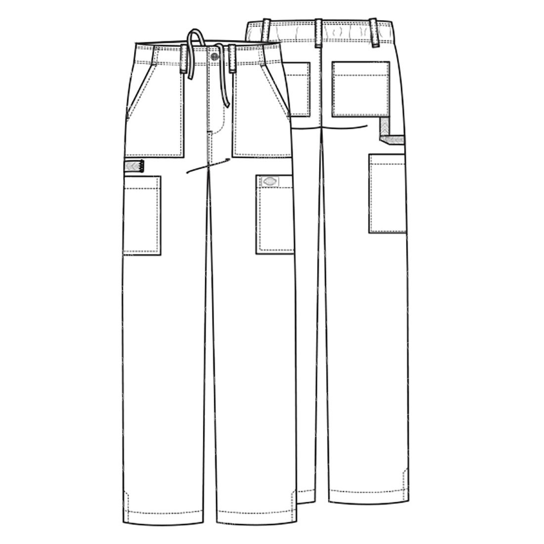 Мужские брюки Dickies DK015 имеют свободный крой с застежкой-молнией. Они имеют эластичный пояс сзади с застежкой на пуговицы, функциональный внутренний шнурок, несколько шлевок для ремня и шесть карманов: два передних накладных, два грузовых и два задних.