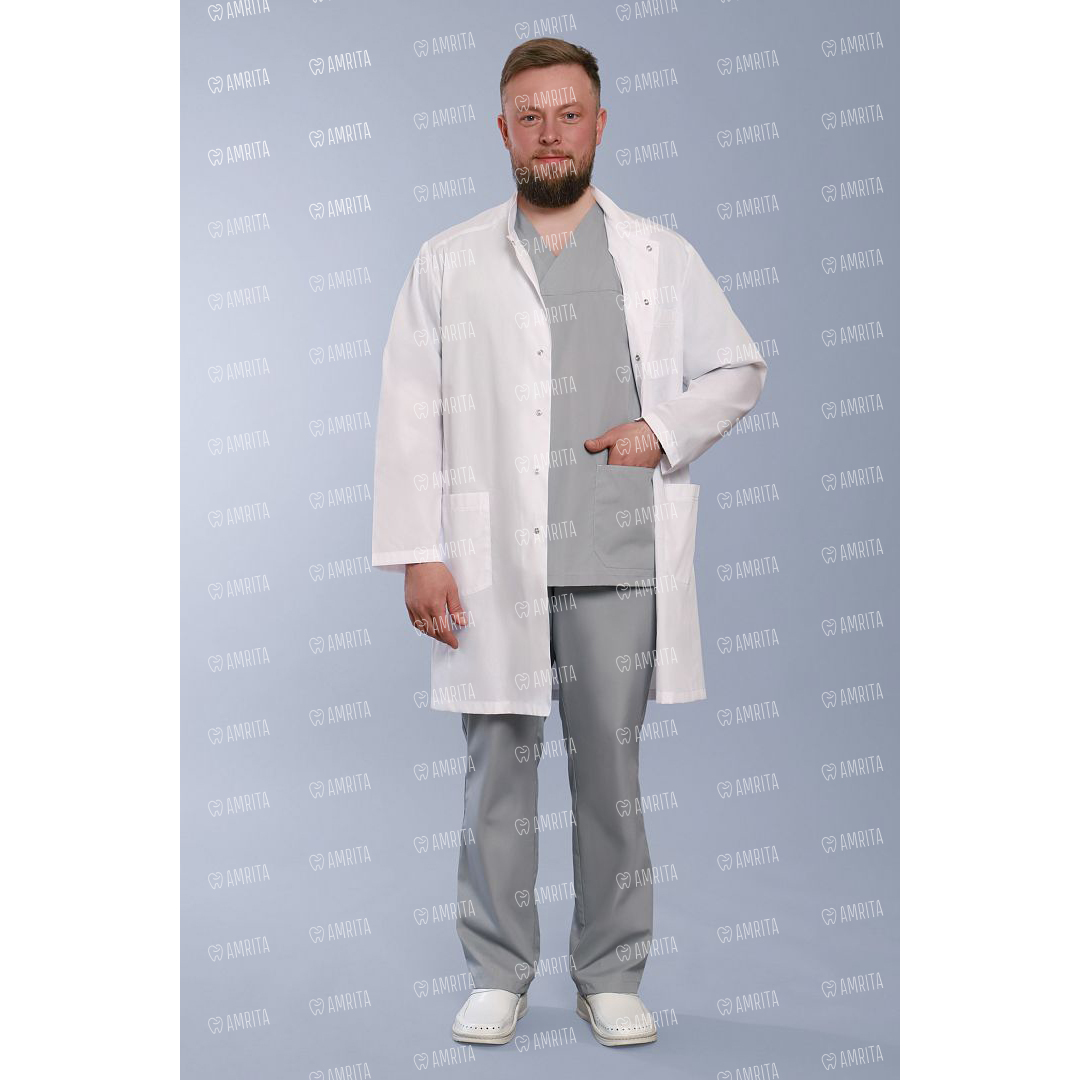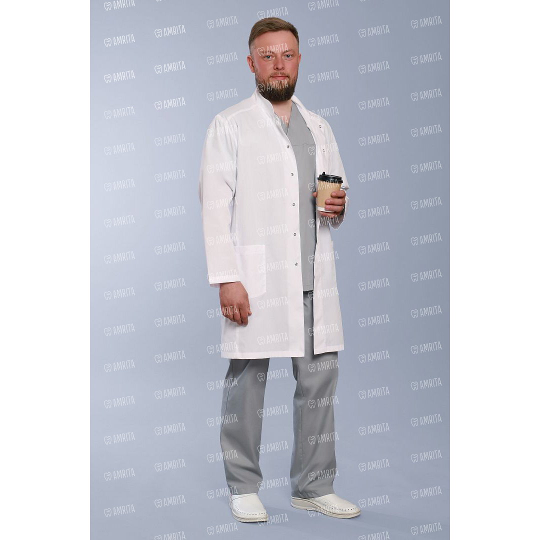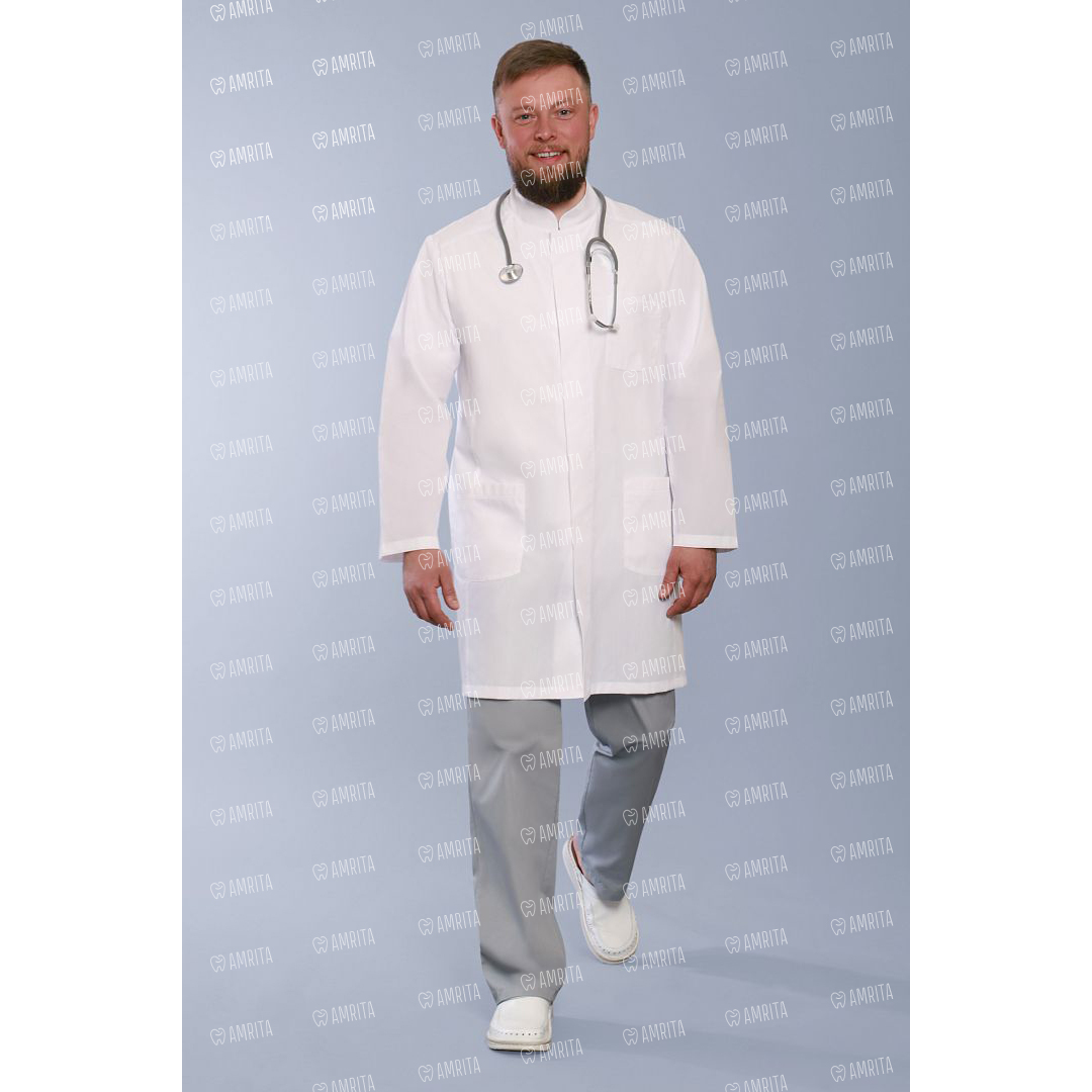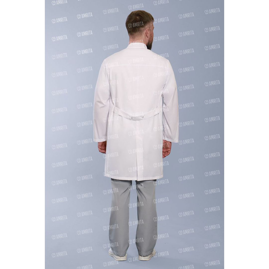Мужской медицинский халат 550 модели имеет современный крой с укороченной длинной и полуприлегающим элегантным силуэтом, который создается за счет рельефов по спинке и полочке. Данная модель оригинальна своим изысканным воротником стойкой и оригинальной супатной застежкой на кнопках, где внутренняя часть стойки воротника и внутренняя часть супатной застежки выполнены из контрастной отделочной ткани. Дополняет изделие практичные и функциональные накладные карманы.