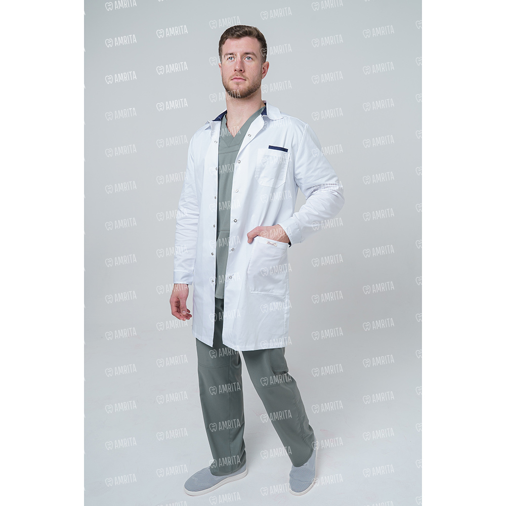 Мужской медицинский халат 236ТСД от производителя СтильБ имеет современный прямой крой, длинный рукав с манжетами и отложной воротник с контрастной вставкой внутри. Изделие застегивает на пуговицы спереди и дополнено двумя накладными карманами и одним нагрудным.