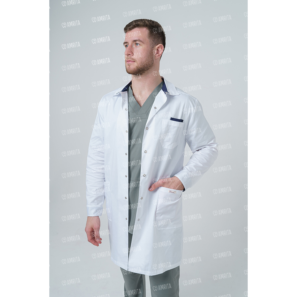 Мужской медицинский халат 236ТСД от производителя СтильБ имеет современный прямой крой, длинный рукав с манжетами и отложной воротник с контрастной вставкой внутри. Изделие застегивает на пуговицы спереди и дополнено двумя накладными карманами и одним нагрудным.