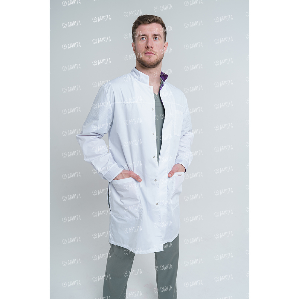 Мужской медицинский халат 165ТСД от производителя СтильБ имеет прямой крой, длинный рукав с манжетами и воротник стойку. Изделие застегивает на металлические кнопки спереди и дополнено двумя накладными карманами и одним нагрудным.