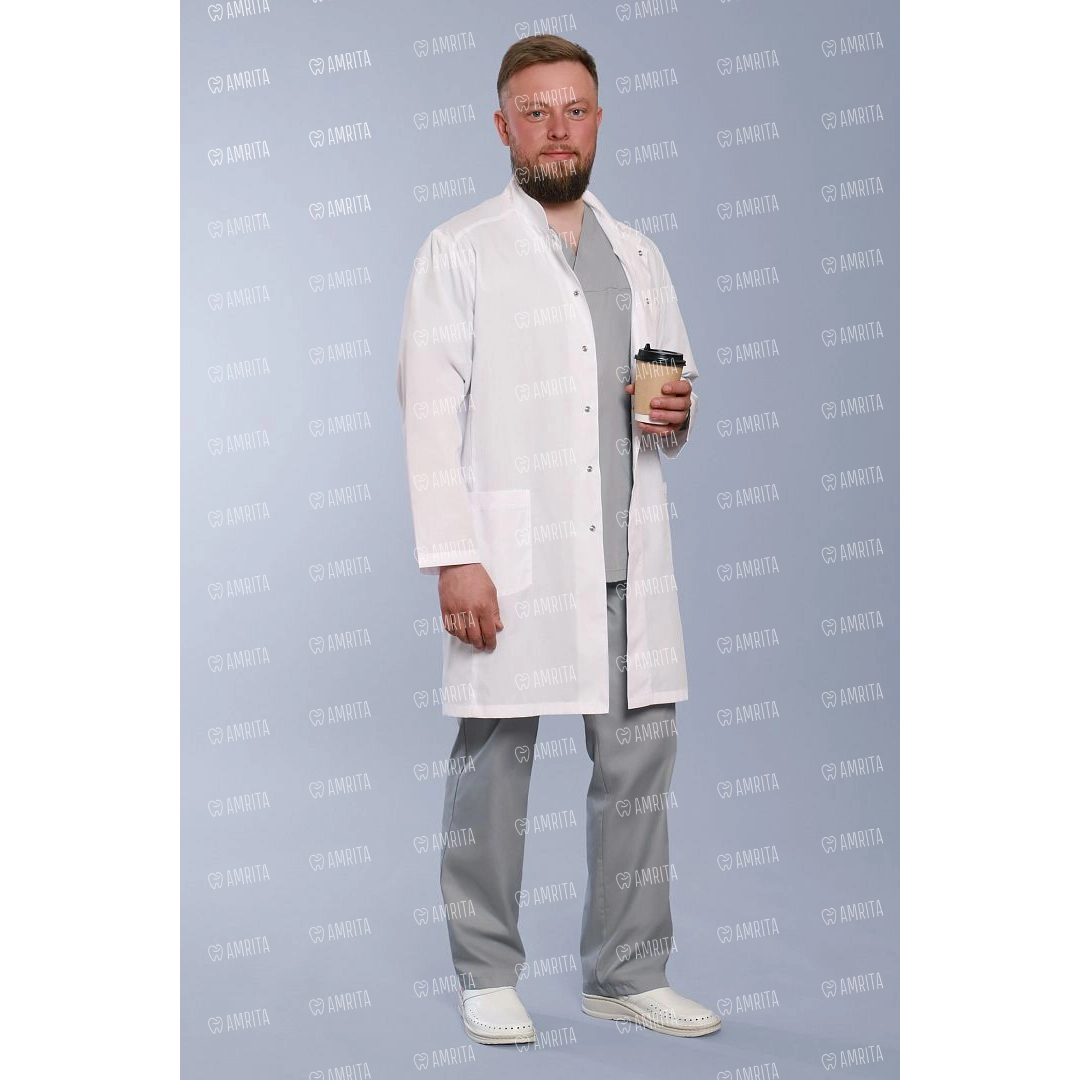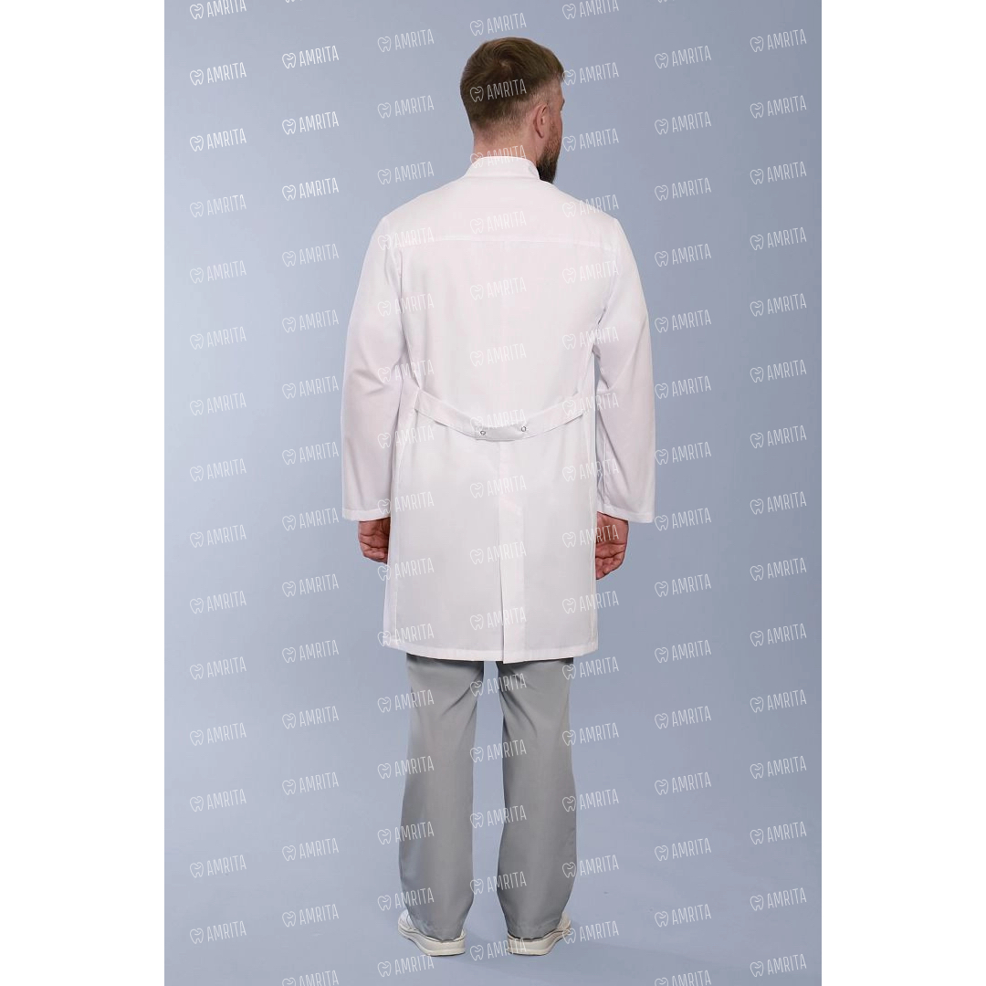 Современная модель мужского укороченного халата 550 от бренда Doctor Big. Полуприлегающий силуэт создается рельефами по спинке и полочке. Воротник стойка и супатная застежка на кнопках. Внутренняя стойка воротника и внутренняя часть супатной застежки выполнены из контрастной отделочной ткани. Практичные накладные карманы.