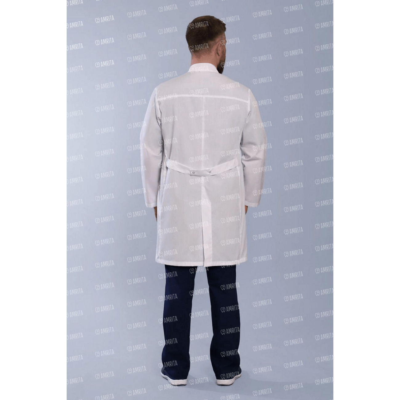 Строгий, удлиненный халат 502 прямого силуэта, с длинными рукавами, застежкой на кнопках, шлицей и полупоясами по спинке. Воротник стойка. Дополняют халат практичные и функциональные накладные карманы. А для удобного доступа к брючным карманам медицинской формы в халате предусмотрены разрезы.