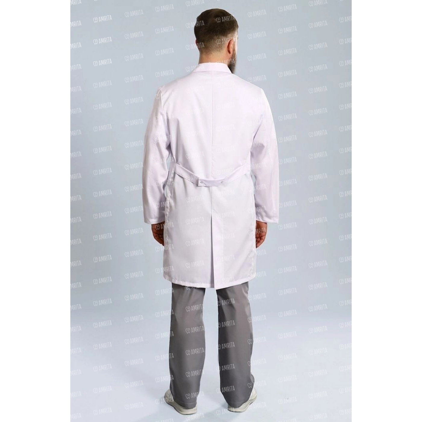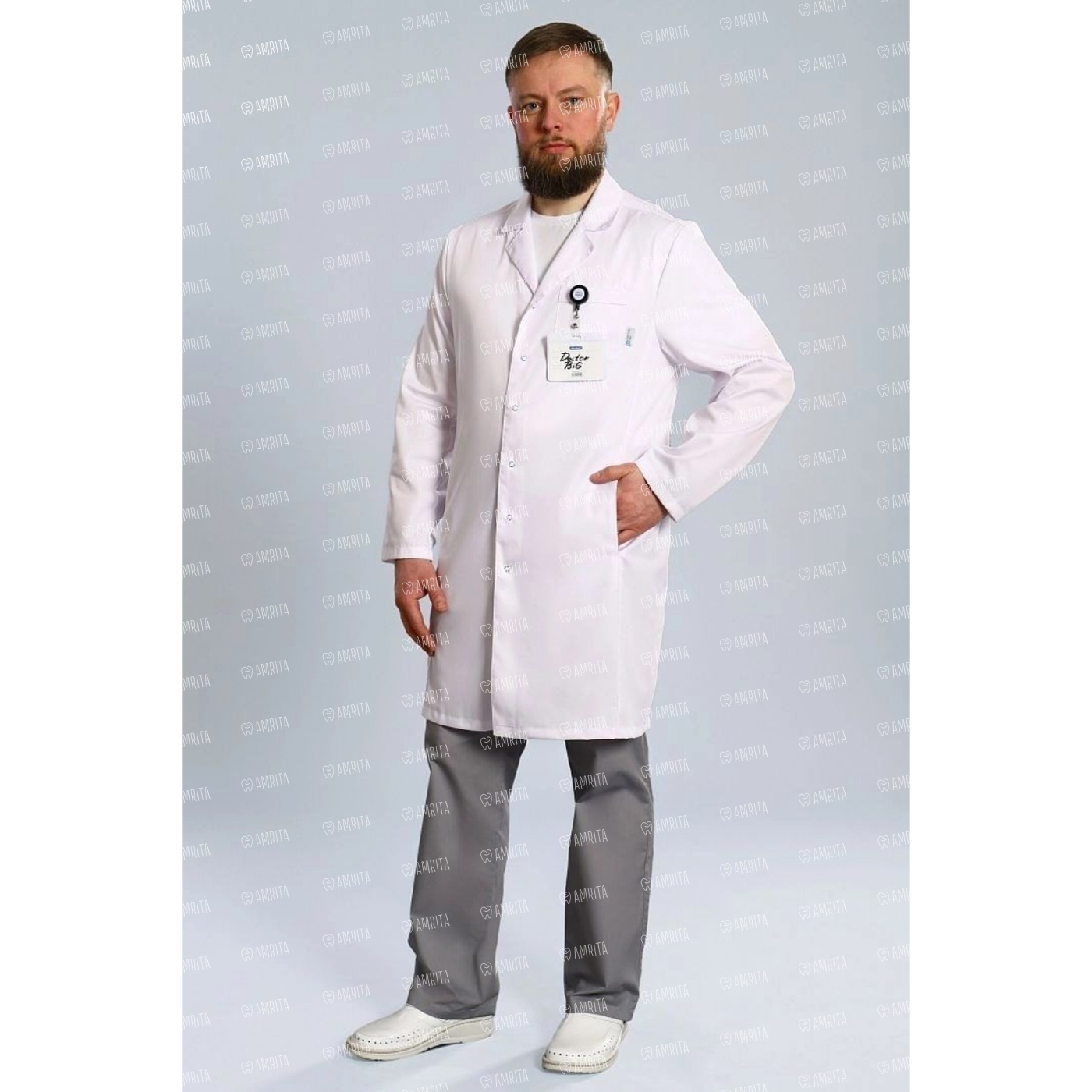 Мужской медицинский халат модели 510 имеет классический крой с воротником пиджачного типа. Модель имеет длинный рукав, длину до линии колена, один нагрудный карман и два кармана скрытых в боковых швах.