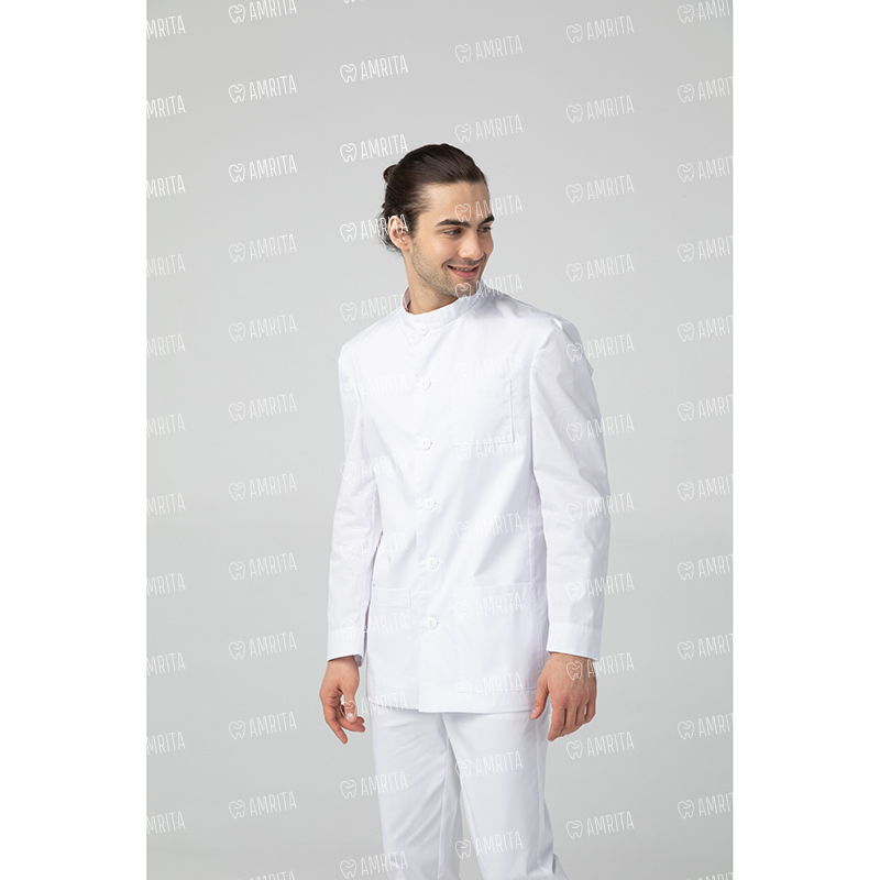 Мужской медицинский пиджак от бренда Dr.Nice имеет длинный рукав, воротник-стойку, разрез-шлицу сзади, один нагрудный карман и два передних накладных. Изделие застегивается на пуговицы спереди.