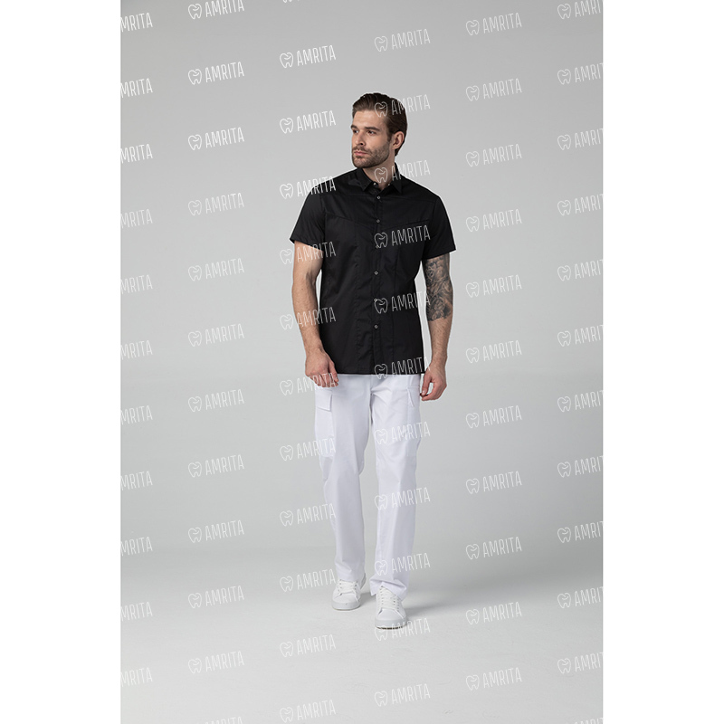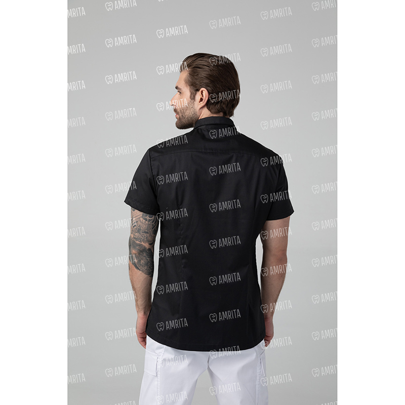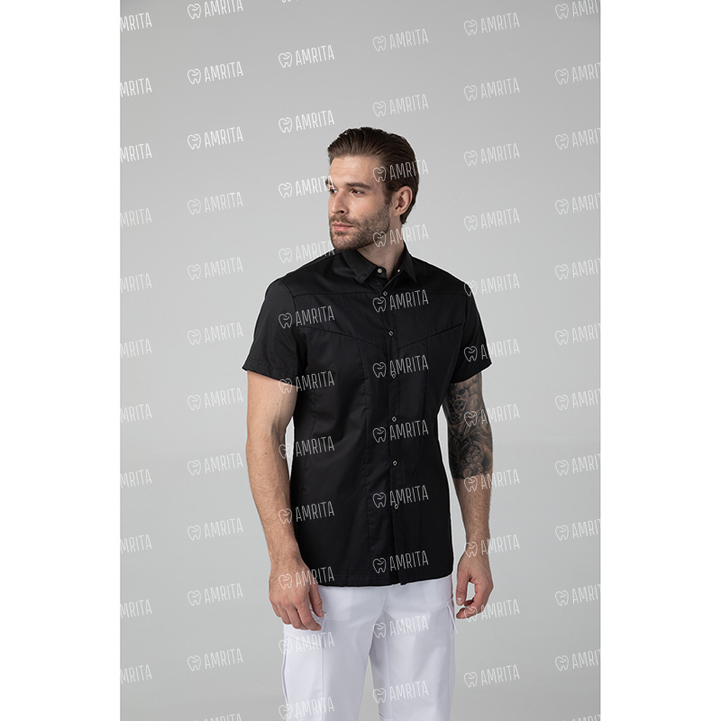 Мужская медицинская рубашка с отложным воротником от бренда Dr.Nice выполнена в современном стиле. Изделие имеет короткий рукав и застегивается спереди на металлические кнопки.