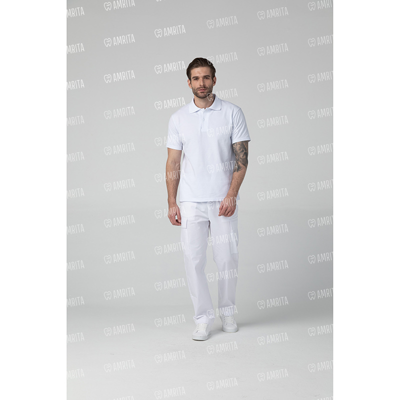 Мужская медицинская рубашка поло Dr.Nice с коротким рукавом и отложным воротничком. Застежка на пуговицах, в боковых швах имеются разрезы.