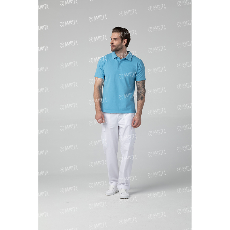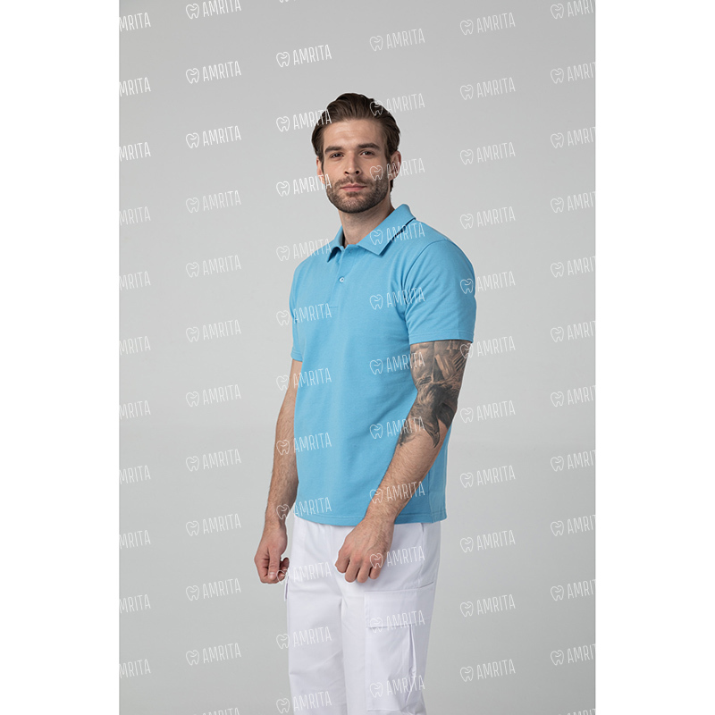 Мужская медицинская рубашка поло Dr.Nice с коротким рукавом и отложным воротничком. Застежка на пуговицах, в боковых швах имеются разрезы.