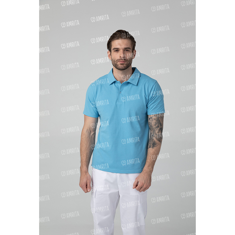 Мужская медицинская рубашка поло Dr.Nice с коротким рукавом и отложным воротничком. Застежка на пуговицах, в боковых швах имеются разрезы.