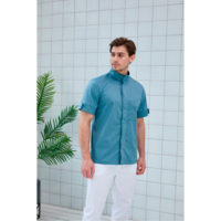 Мужская медицинская рубашка с коротким рукавом имеет манжеты, которые декорированы дополнительной деталью. Изделие застегивается на кнопки и дополнено нагрудным карманом.