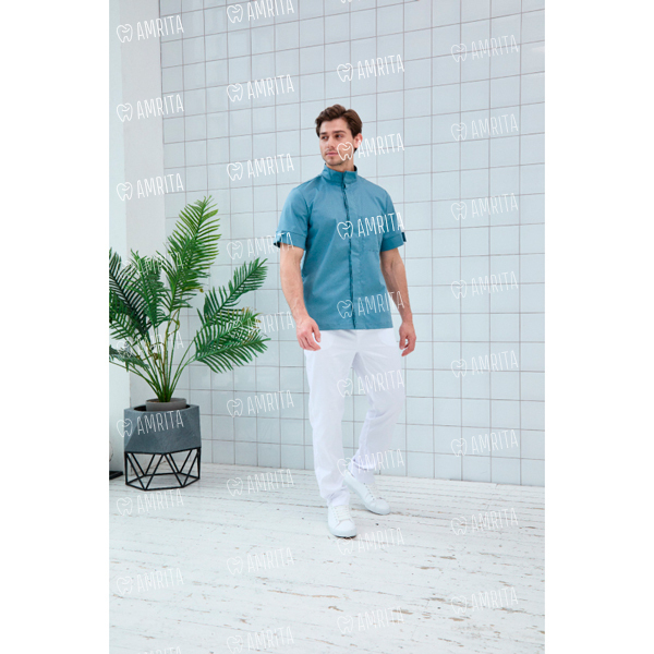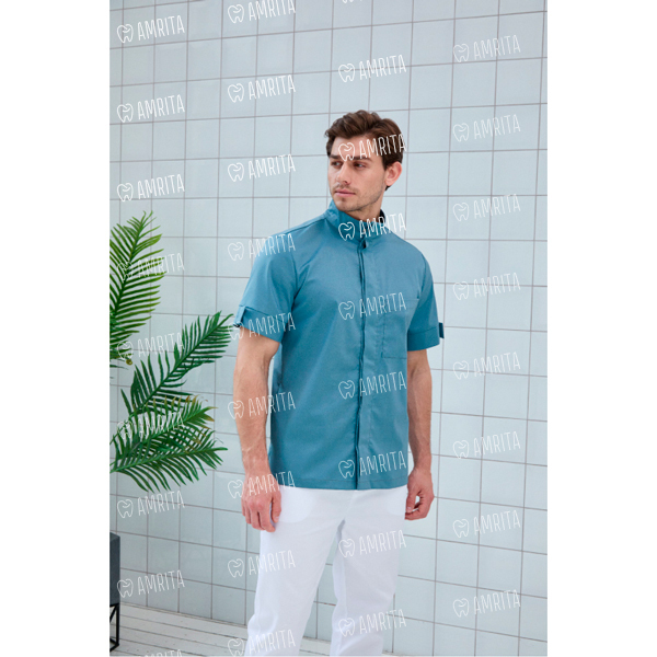 Мужская медицинская рубашка с коротким рукавом имеет манжеты, которые декорированы дополнительной деталью. Изделие застегивается на кнопки и дополнено нагрудным карманом.