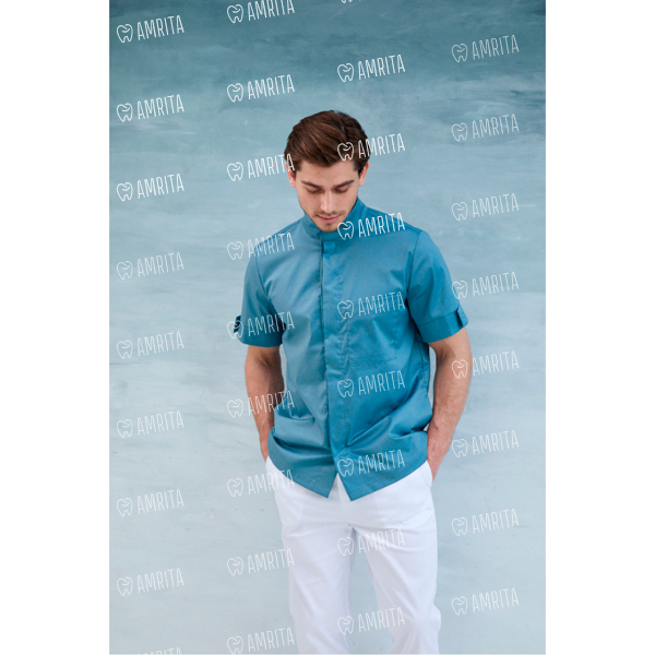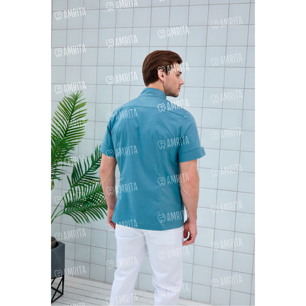Мужская медицинская рубашка с коротким рукавом имеет манжеты, которые декорированы дополнительной деталью. Изделие застегивается на кнопки и дополнено нагрудным карманом.