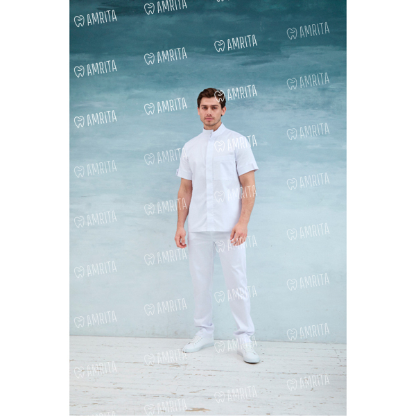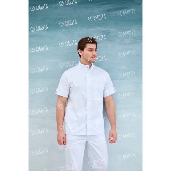 Мужская медицинская рубашка с коротким рукавом имеет манжеты, которые декорированы дополнительной деталью. Изделие застегивается на кнопки и дополнено нагрудным карманом.