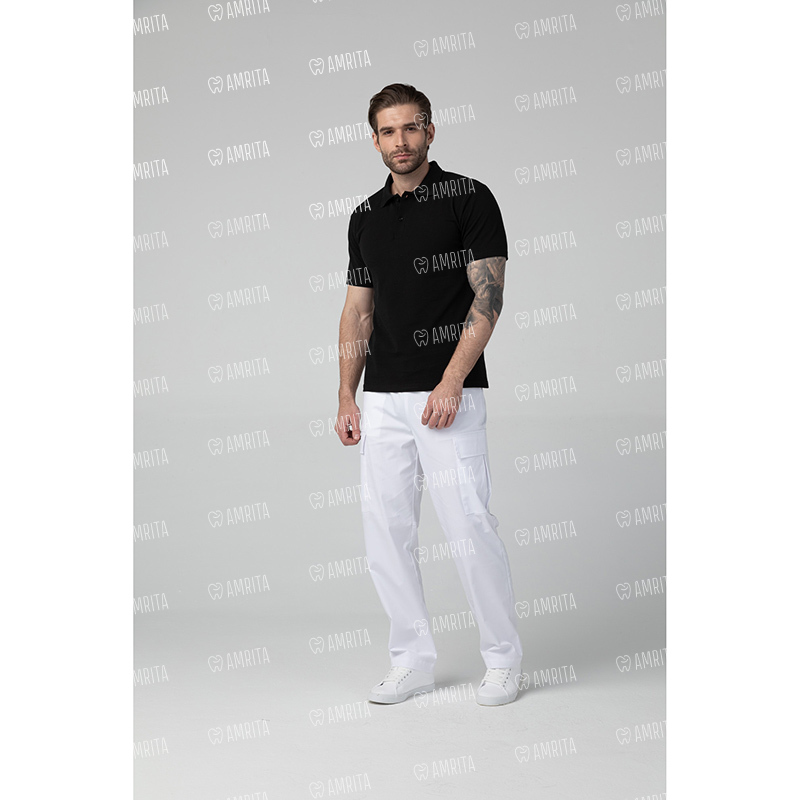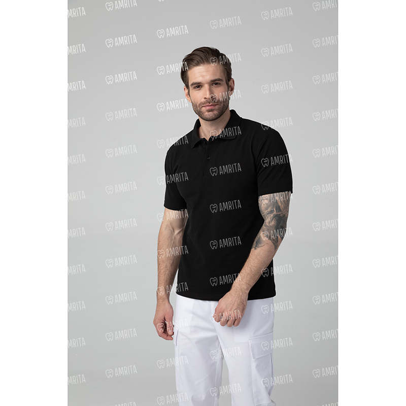 Мужская медицинская рубашка поло Dr.Nice с коротким рукавом и отложным воротничком. Застежка на пуговицах, в боковых швах имеются разрезы.
