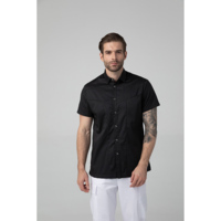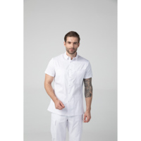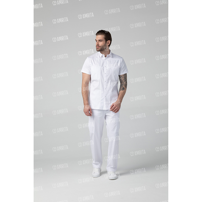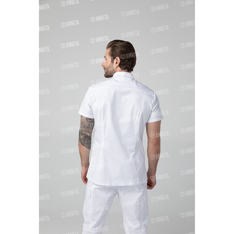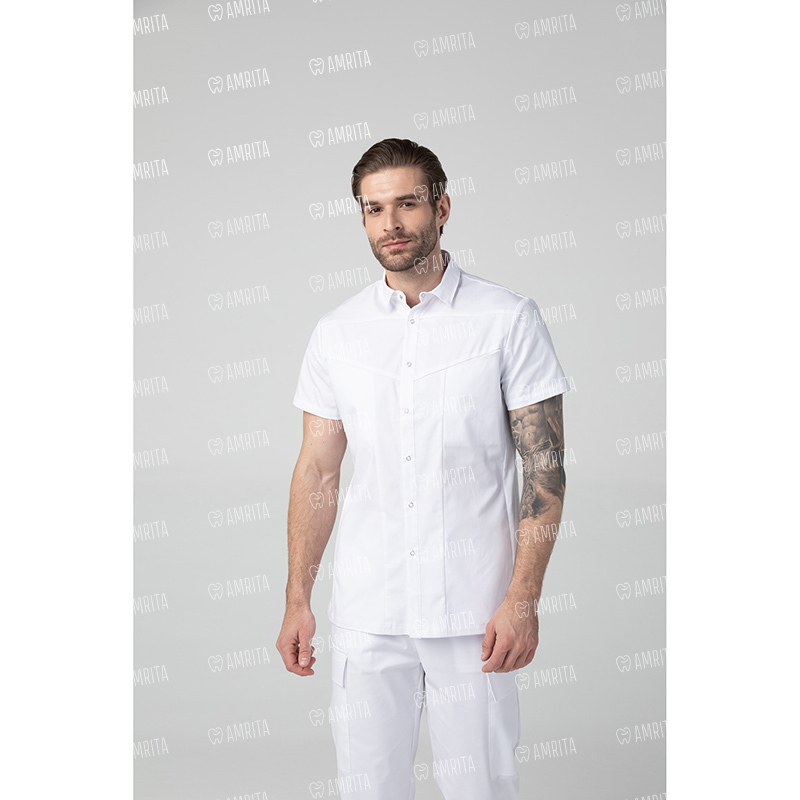 Мужская медицинская рубашка с отложным воротником от бренда Dr.Nice выполнена в современном стиле. Изделие имеет короткий рукав и застегивается спереди на металлические кнопки.