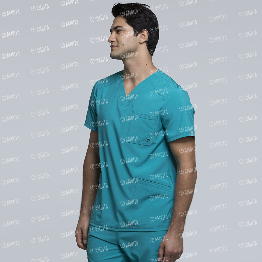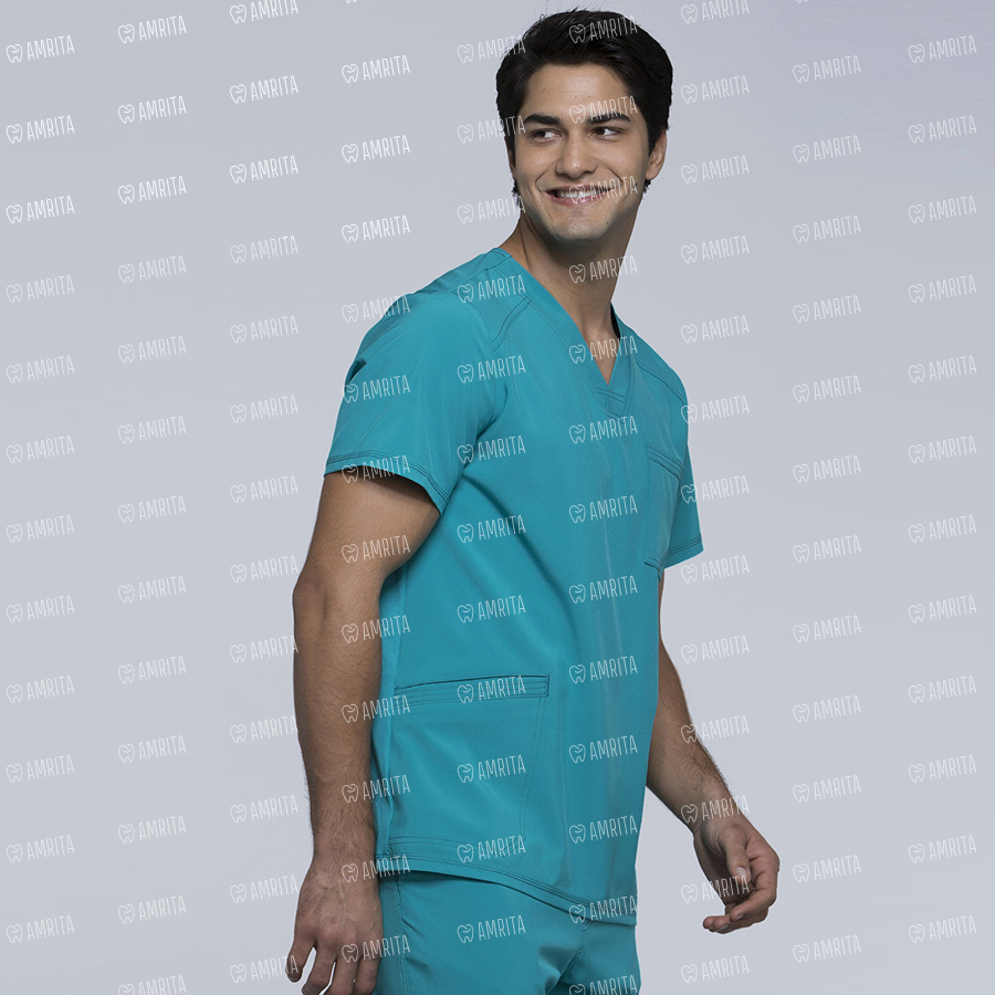 Мужской медицинский топ Cherokee CK900A выполнен в современном крое, имеет V-образный вырез в стиле модерн, нагрудный карман с люверсами, прорезные передние карманы с тройной строчкой, переднюю и заднюю кокетки и эластичные вставки на спине в рубчик для дополнительного комфорта.