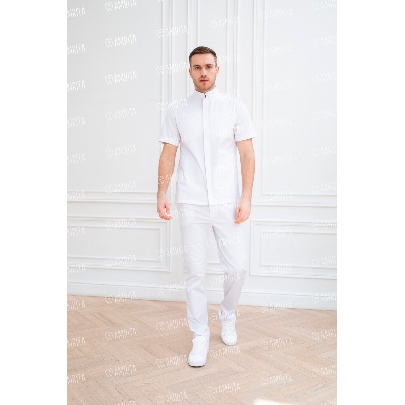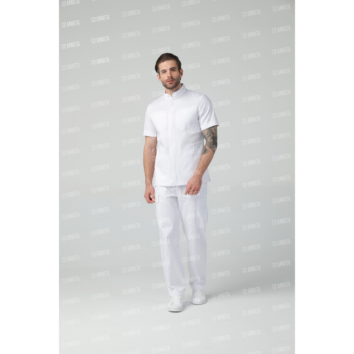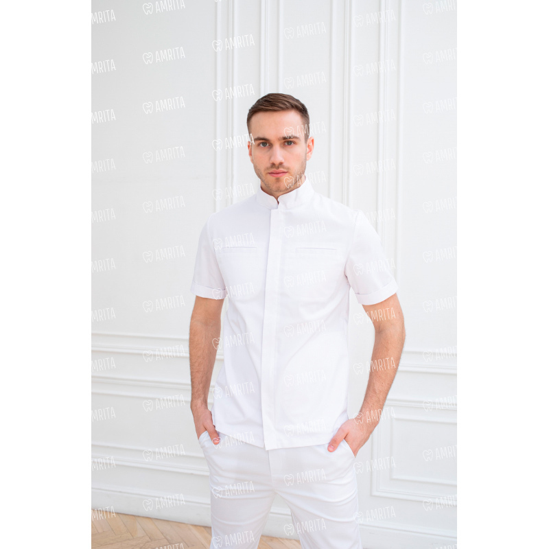 Медицинская мужская рубашка бренда Dr.Nice выполнена в современном крое с воротником-стойкой и с короткими рукавами. Модель с супатной застежкой на молнии и имеет два нагрудных кармана и два боковых.