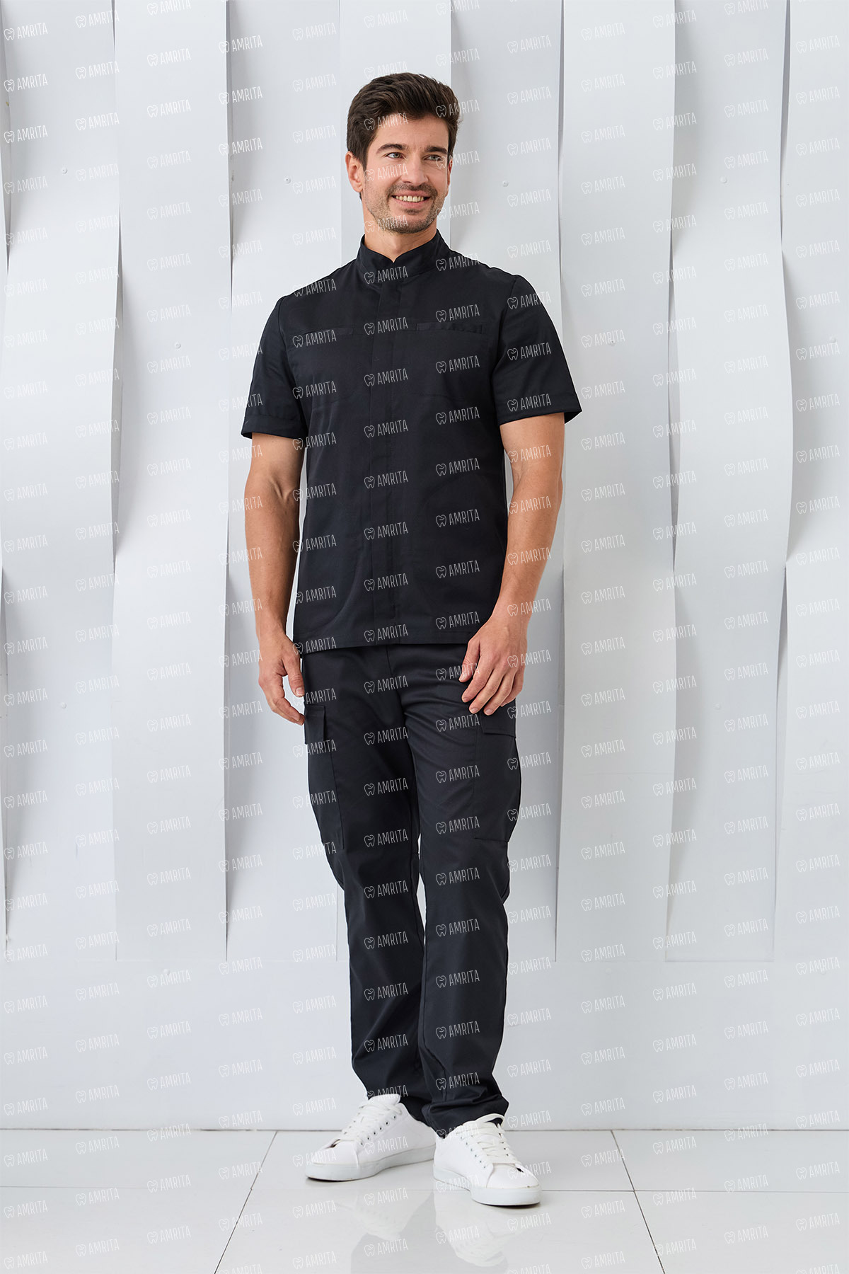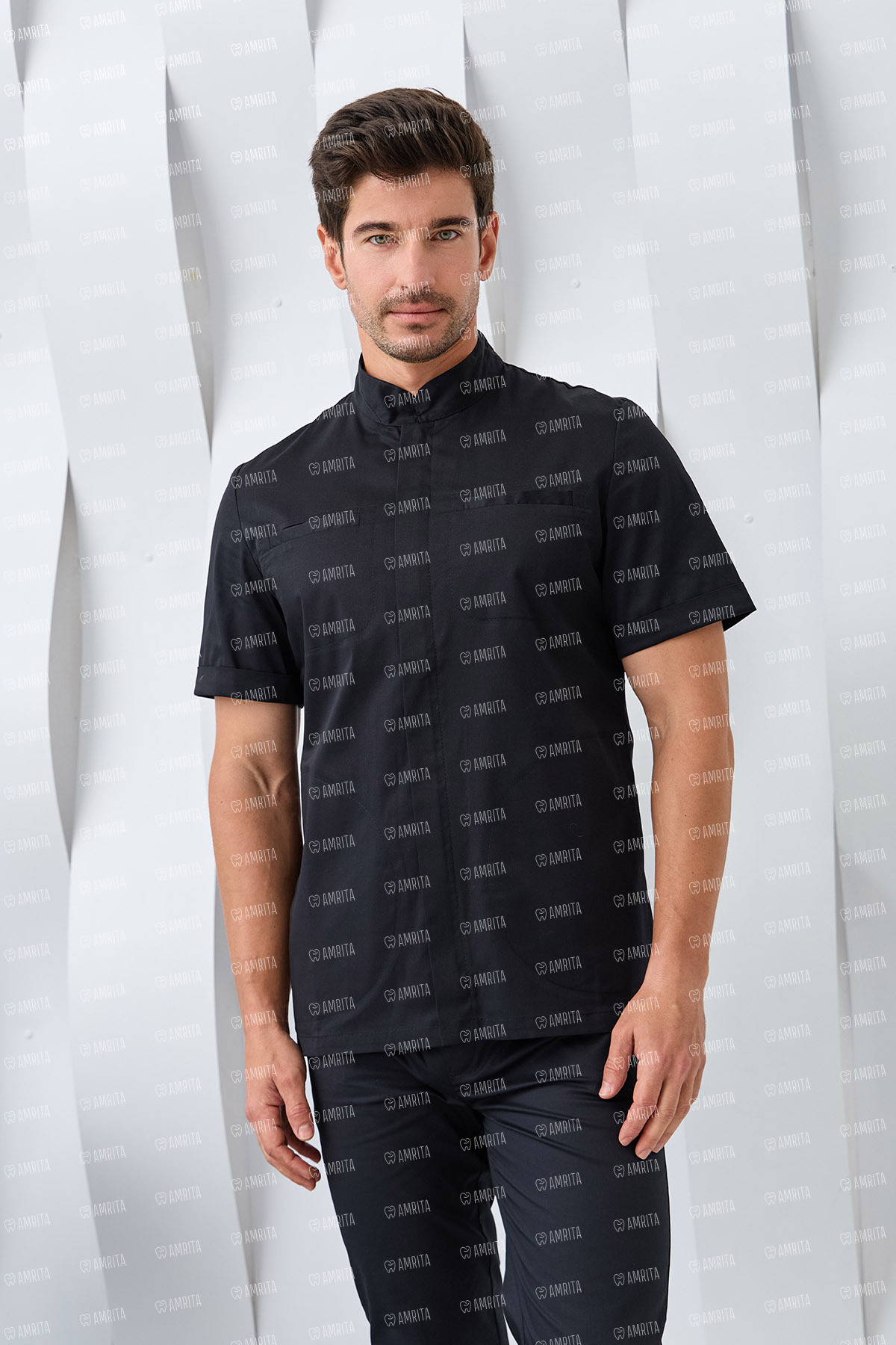 Медицинская мужская рубашка бренда Dr.Nice выполнена в современном крое с воротником-стойкой и с короткими рукавами. Модель с супатной застежкой на молнии и имеет два нагрудных кармана и два боковых.