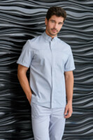Медицинская мужская рубашка бренда Dr.Nice выполнена в современном крое с воротником-стойкой и с короткими рукавами. Модель с супатной застежкой на молнии и имеет два нагрудных кармана и два боковых.