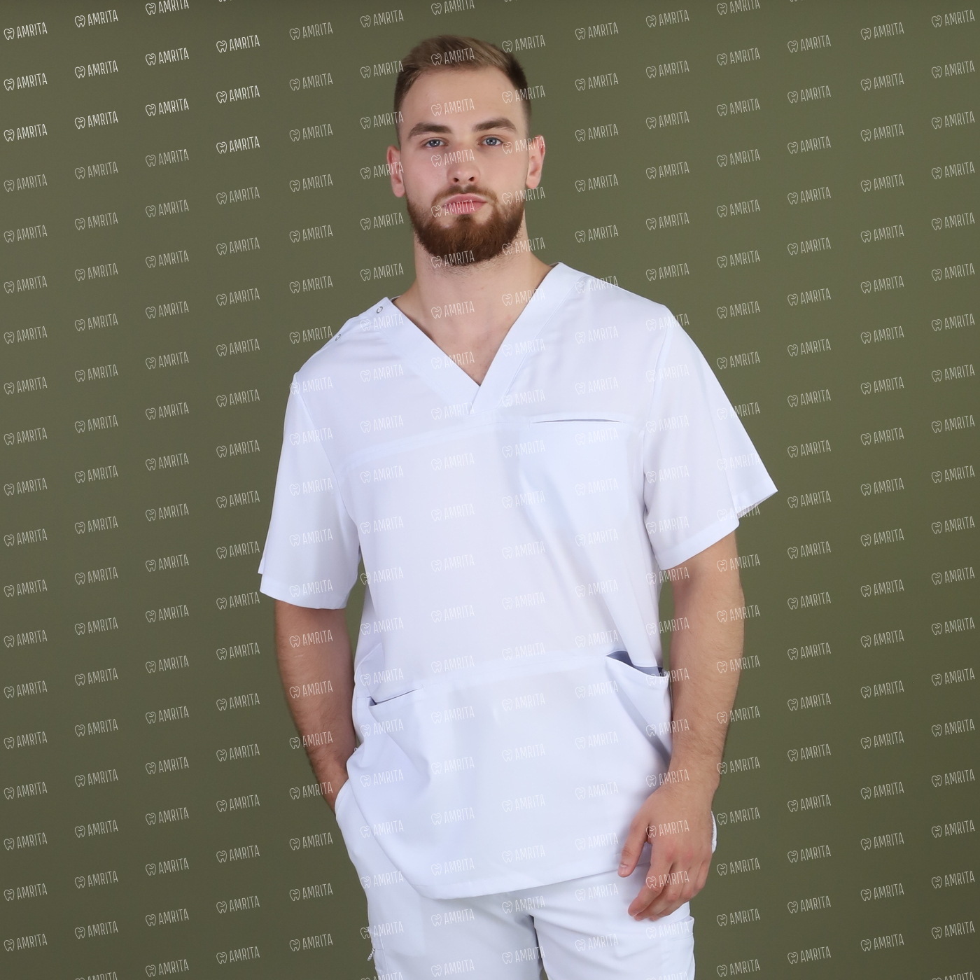 В основе дизайна — прямой крой с классическим V-образным вырезом. Ключевым элементом выступает асимметричная застежка на кнопках на плече, которая служит как стильным акцентом, так и функциональной деталью для удобства надевания. Продуманная система из трех карманов — нагрудного и двух нижних накладных — отвечает за практичность, а разрезы в боковых швах гарантируют свободу движений.