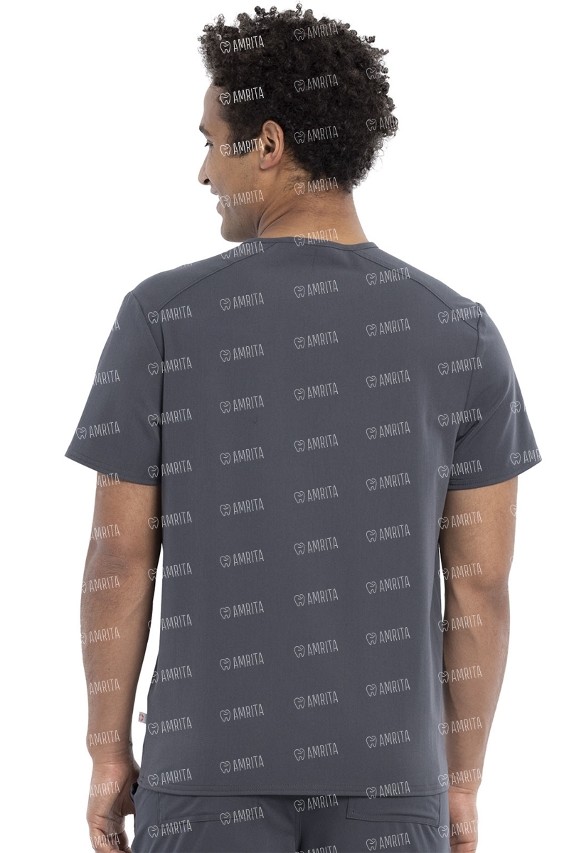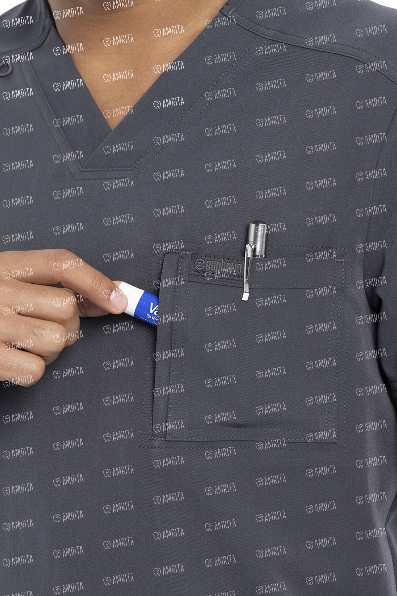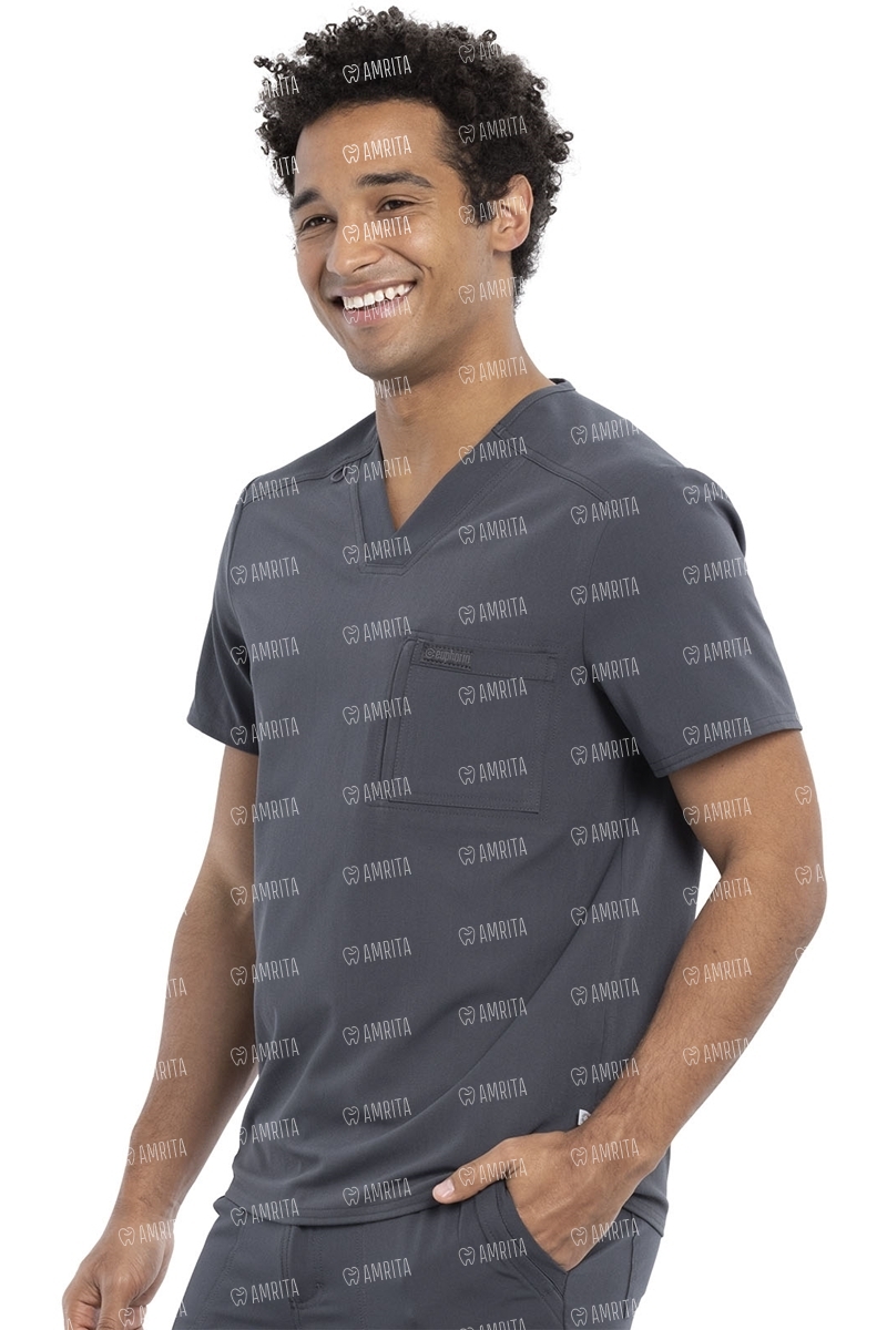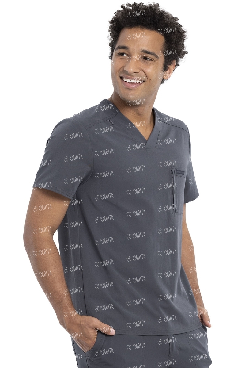 Мужской топ с V-образным вырезом, имеет нагрудный карман, эластичные боковые вставки, двойная прострочка швов.