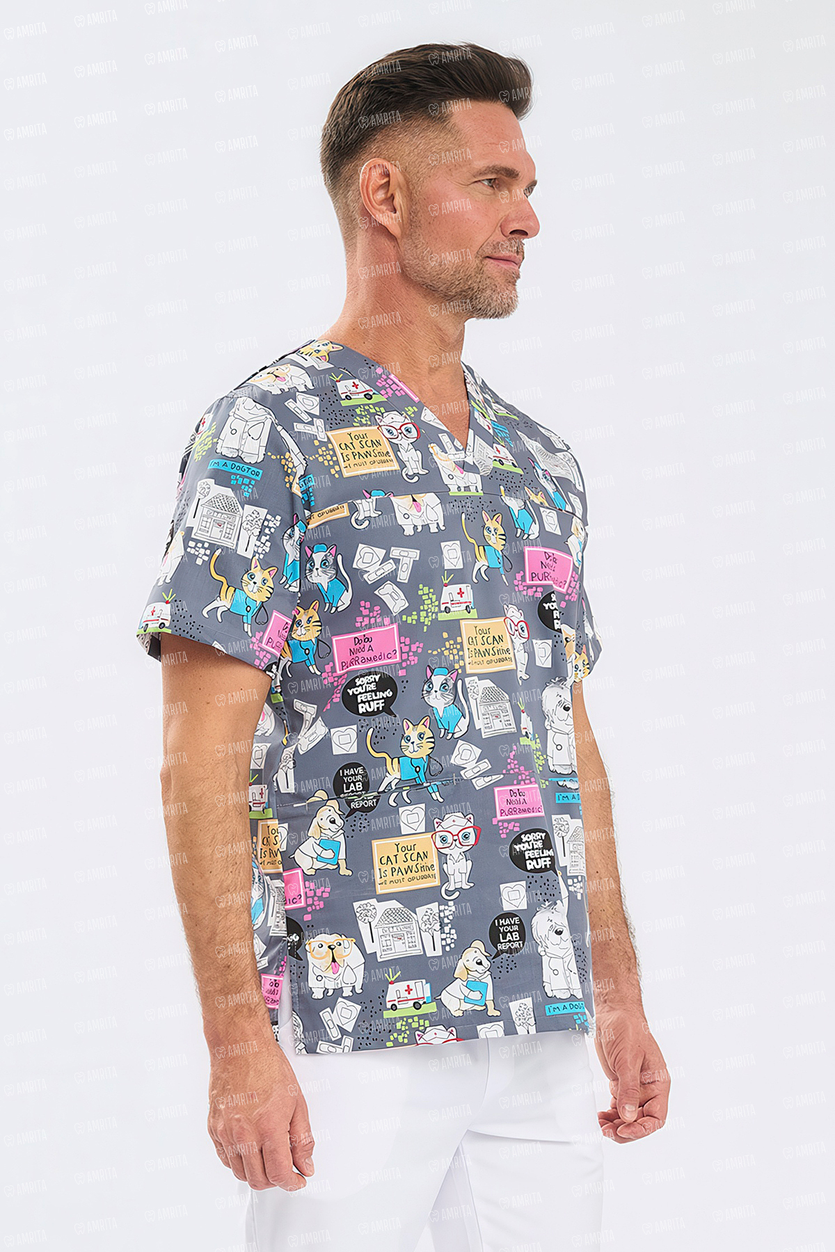 - Дизайн: V-образный вырез, авторский принт «Котики и собачки»