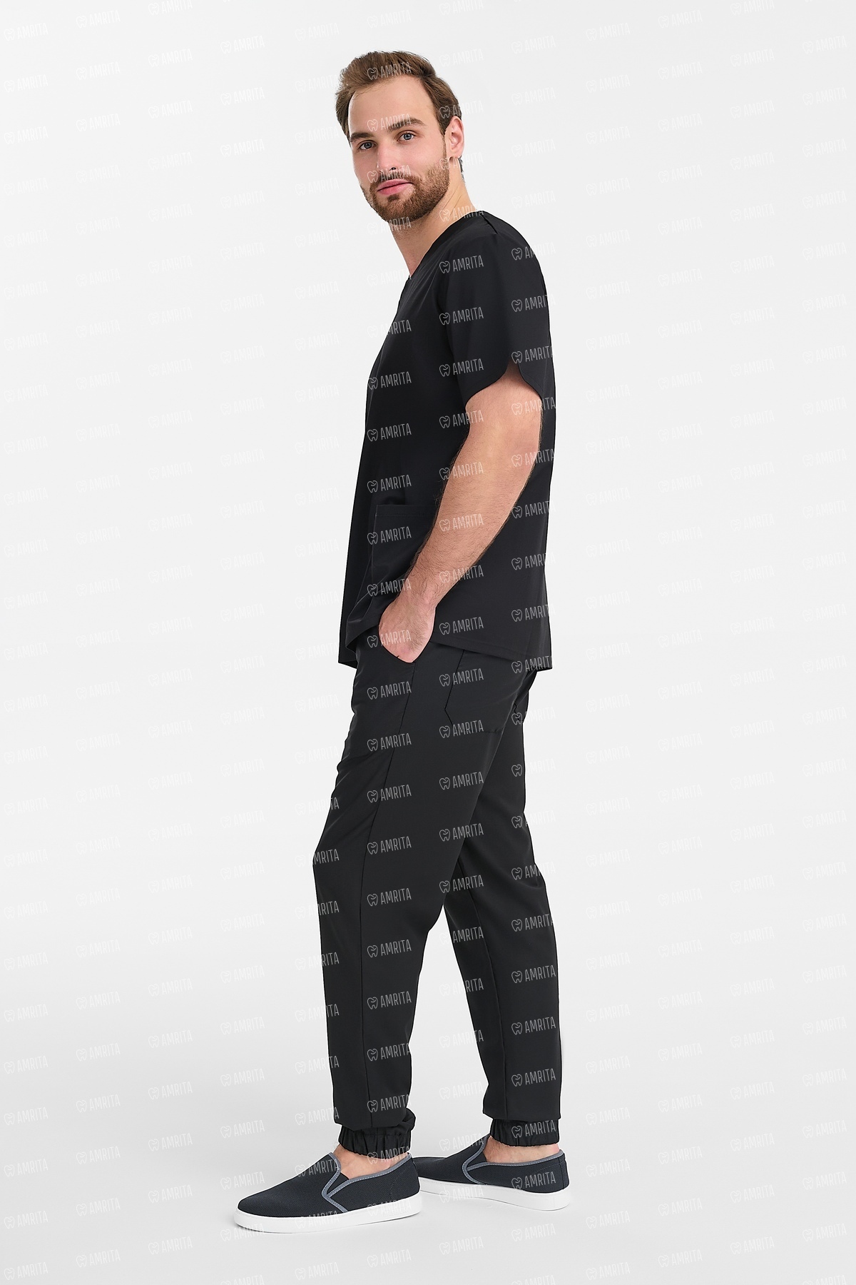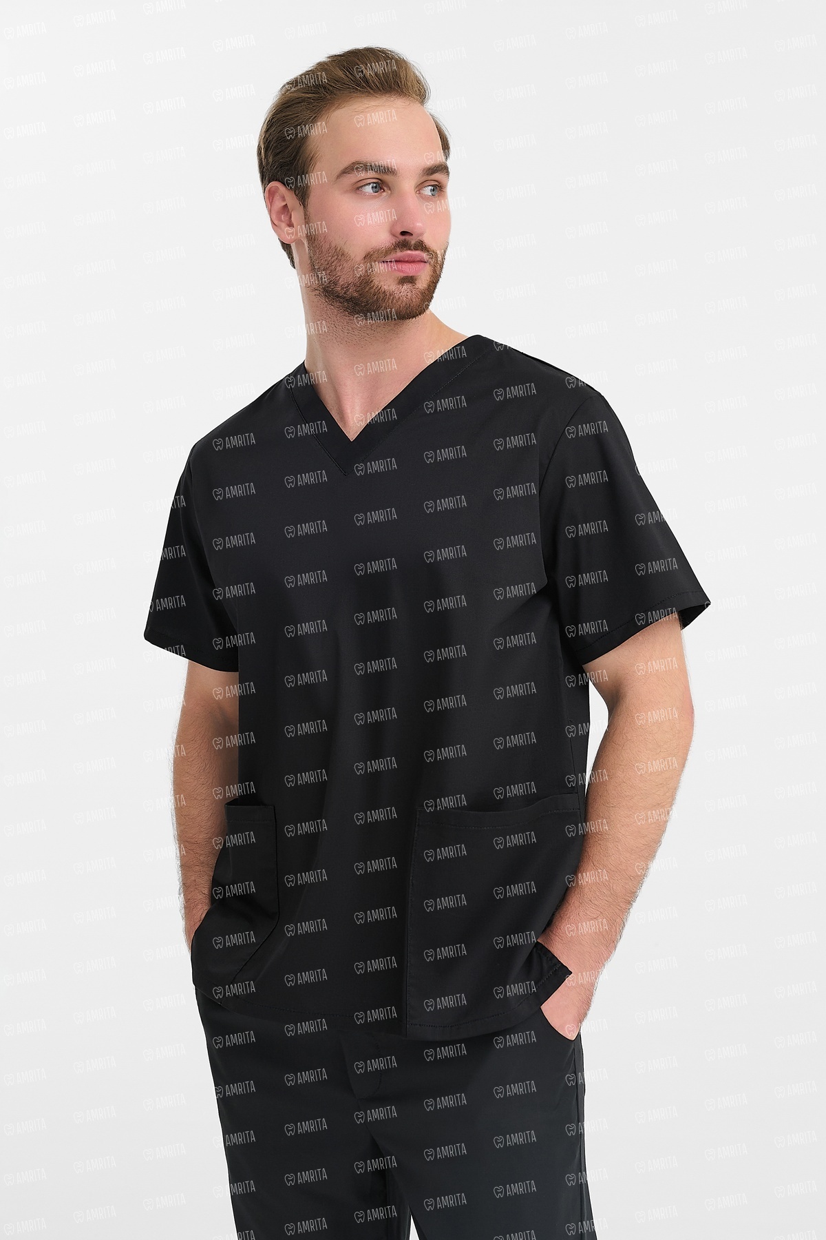 В основе дизайна — классический прямой крой с V-образным вырезом, который служит универсальной и проверенной временем базой для профессионального гардероба. Продуманная система из трех карманов — одного нагрудного и двух нижних накладных — обеспечивает функциональность, а разрезы в боковых швах гарантируют свободу движений.