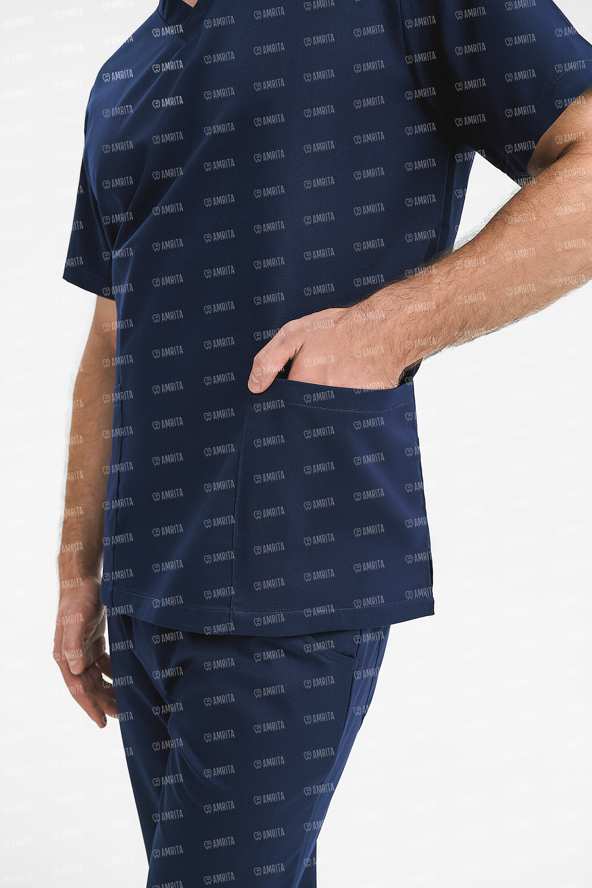 В основе дизайна — классический прямой крой с V-образным вырезом, который служит универсальной и проверенной временем базой для профессионального гардероба. Продуманная система из трех карманов — одного нагрудного и двух нижних накладных — обеспечивает функциональность и удобство в работе.