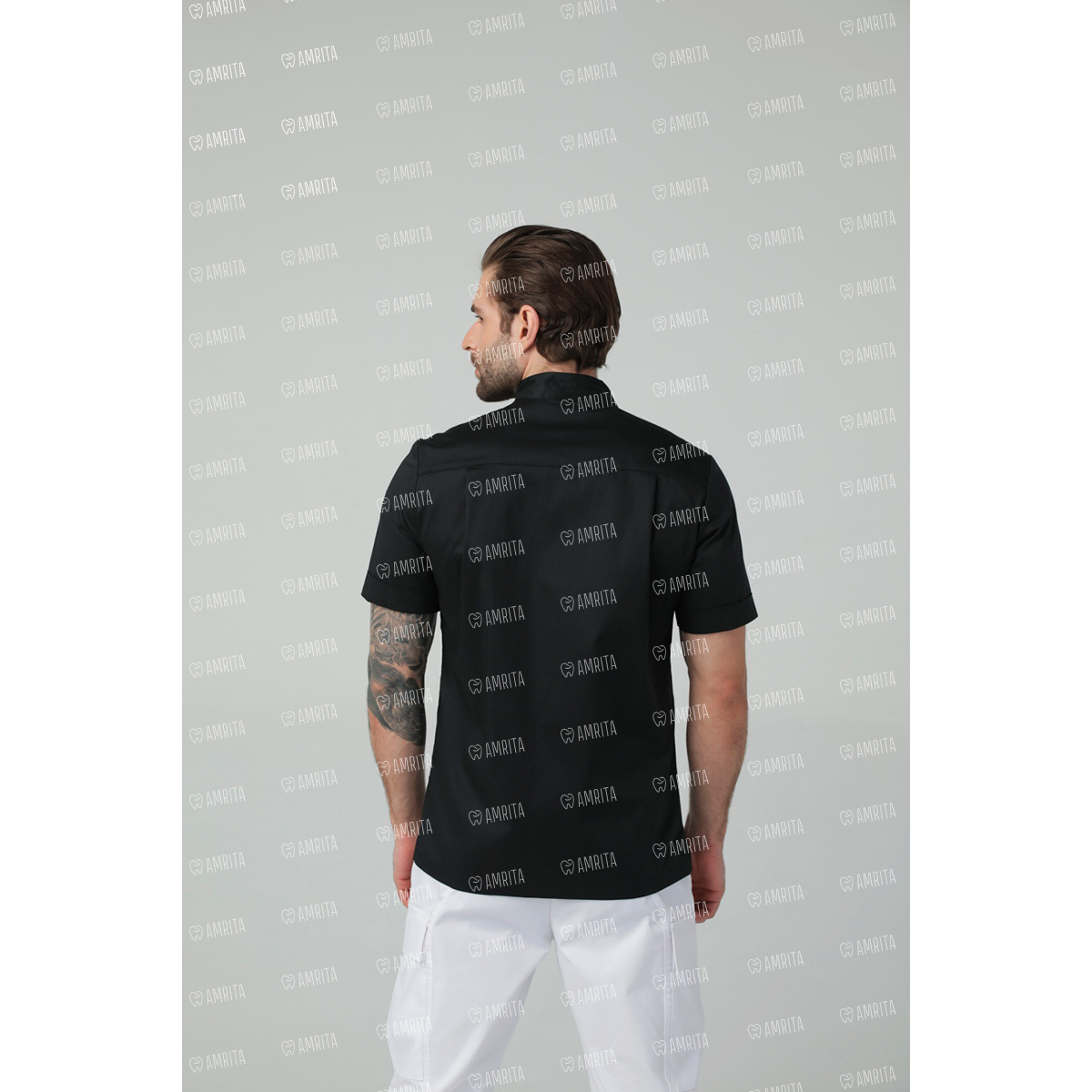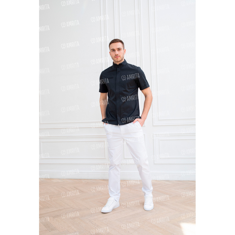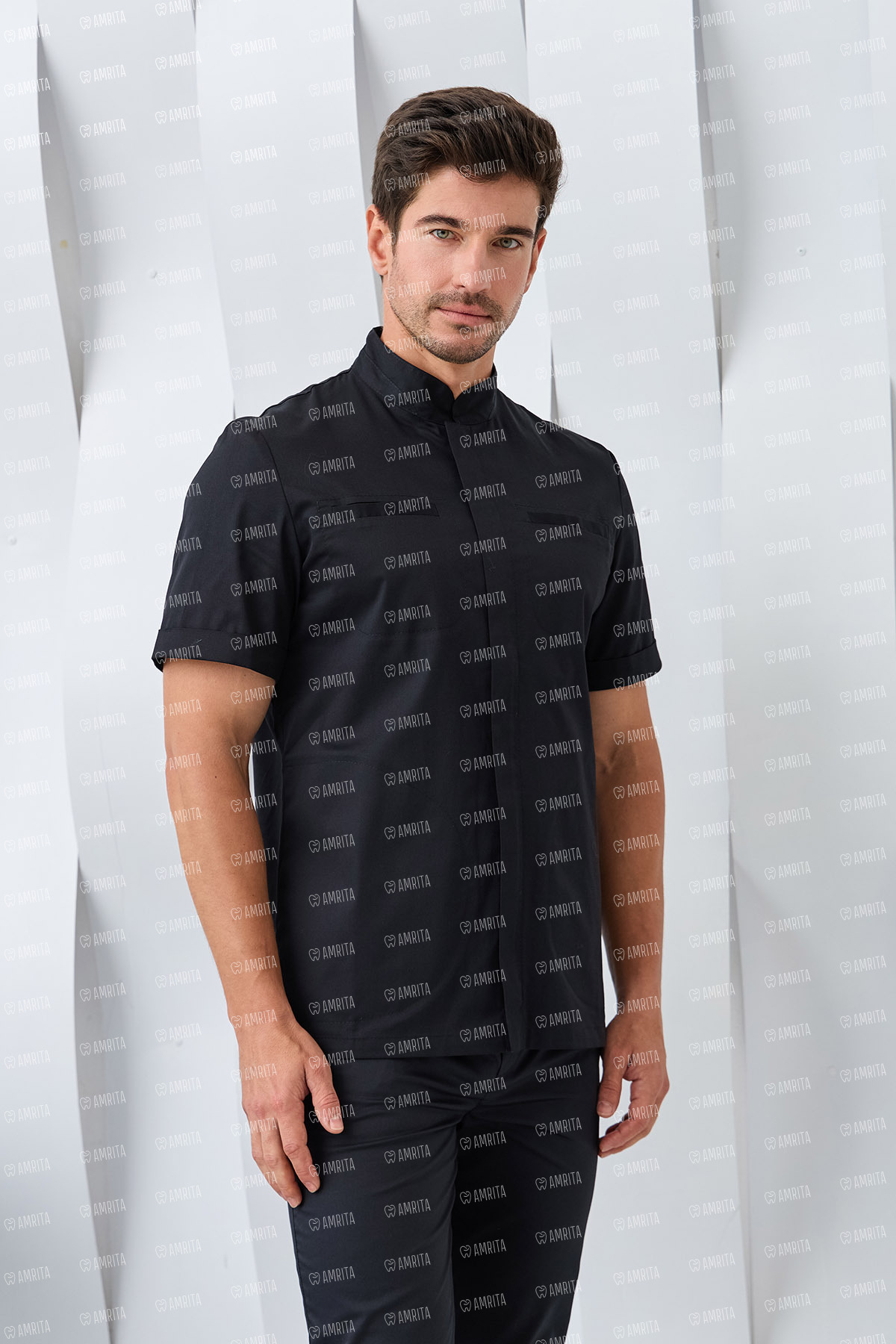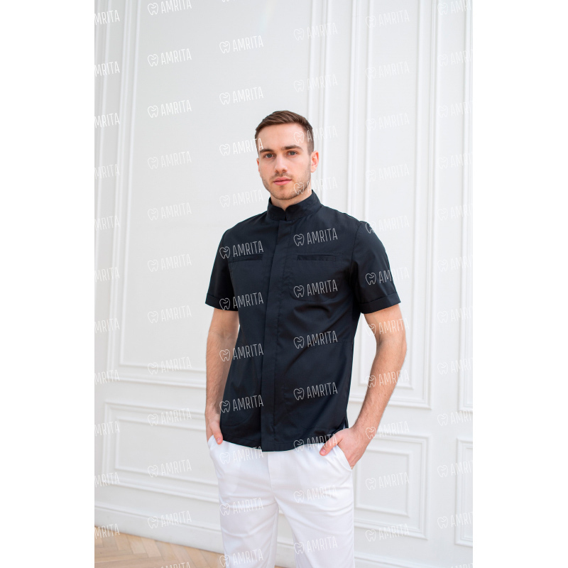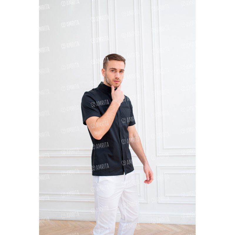 Медицинская мужская рубашка бренда Dr.Nice выполнена в современном крое с воротником-стойкой и с короткими рукавами. Модель с супатной застежкой на молнии и имеет два нагрудных кармана и два боковых.