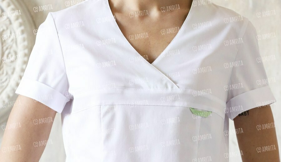 Блуза Альфа белого цвета имеет удобную модель без застежек, короткий рукав с отворотом и прилегающий силуэт. V-образный вырез и стрейч-эффект позволяют легко надевать и снимать блузу. Модель дополнена зеленой декоративной петелькой на груди и двумя накладными карманами по бокам, на одном из которых есть пуговица-смайлик.
