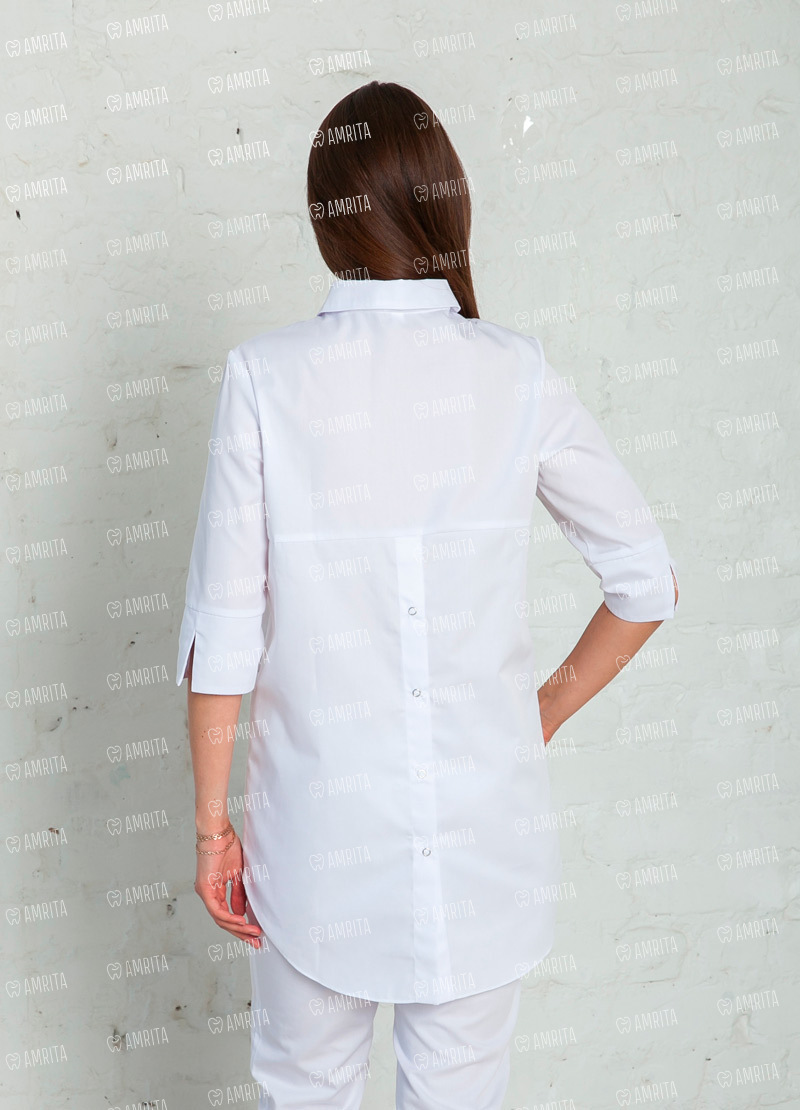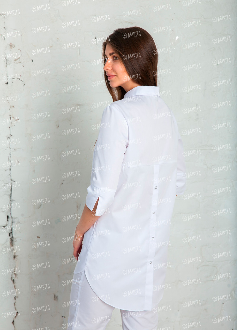 Изящный блузон "Берта" от White Wears с удлиненной задней полочкой и рукавами ¾ позволит выглядеть гармонично и произвести положительное впечатление на нового пациента. Модель свободного кроя, застегивается спереди на металлические кнопки. Для нужных мелочей предусмотрены два накладных вместительных кармана. Этот блузон станет вашей любимой вещью! Сочетайте его с брюками или юбкой, меняя образы. Помимо дизайна, преимуществом нашей модели является материал, из которого она выполнена - основная ткань: сатори (50% хлопок, 50% полиэфир). Это обеспечивает ее износоустойчивость при стирке и дезинфекции.