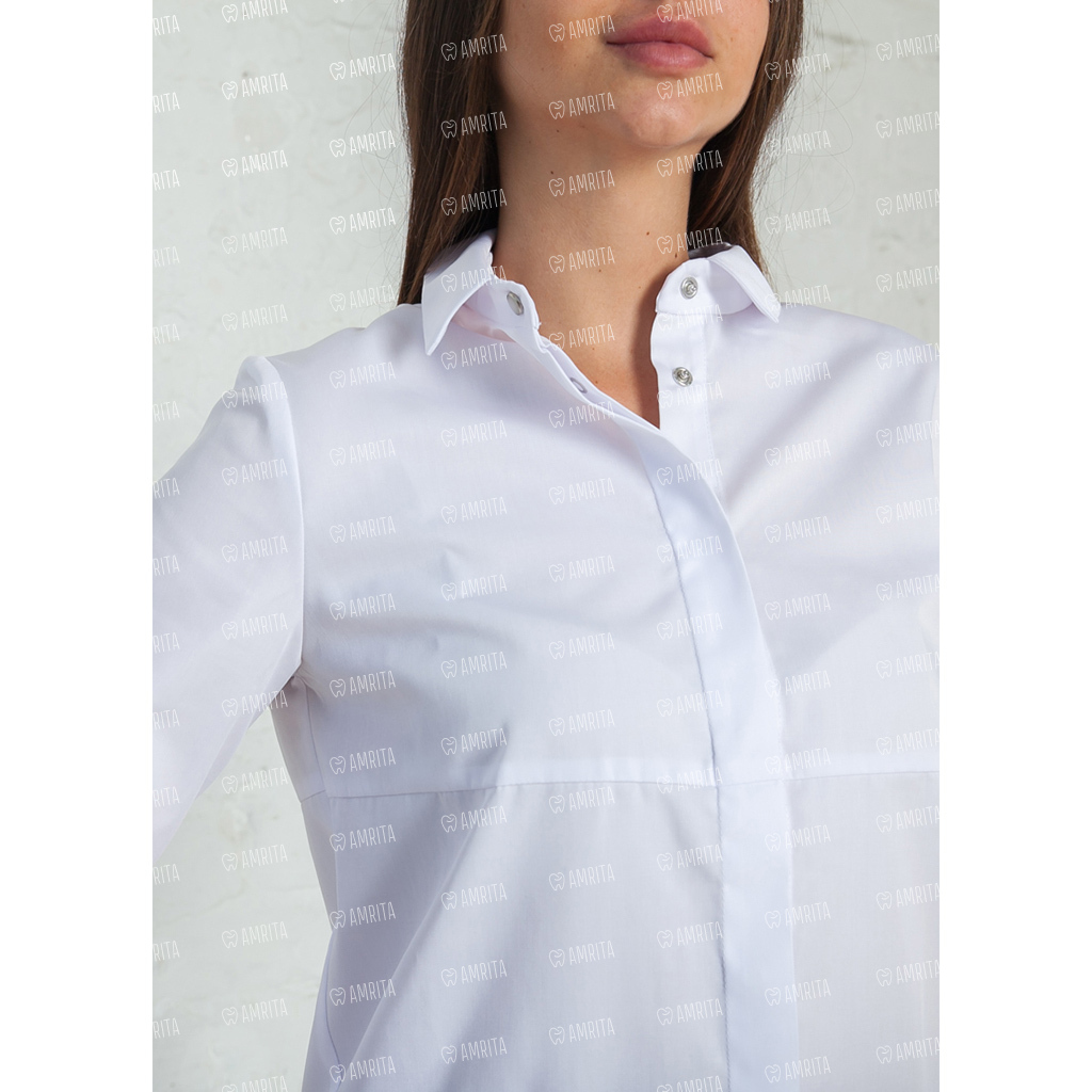 Изящный блузон "Берта" от White Wears с удлиненной задней полочкой и рукавами ¾ позволит выглядеть гармонично и произвести положительное впечатление на нового пациента. Модель свободного кроя, застегивается спереди на металлические кнопки. Для нужных мелочей предусмотрены два накладных вместительных кармана. Этот блузон станет вашей любимой вещью! Сочетайте его с брюками или юбкой, меняя образы. Помимо дизайна, преимуществом нашей модели является материал, из которого она выполнена - основная ткань: сатори (50% хлопок, 50% полиэфир). Это обеспечивает ее износоустойчивость при стирке и дезинфекции.