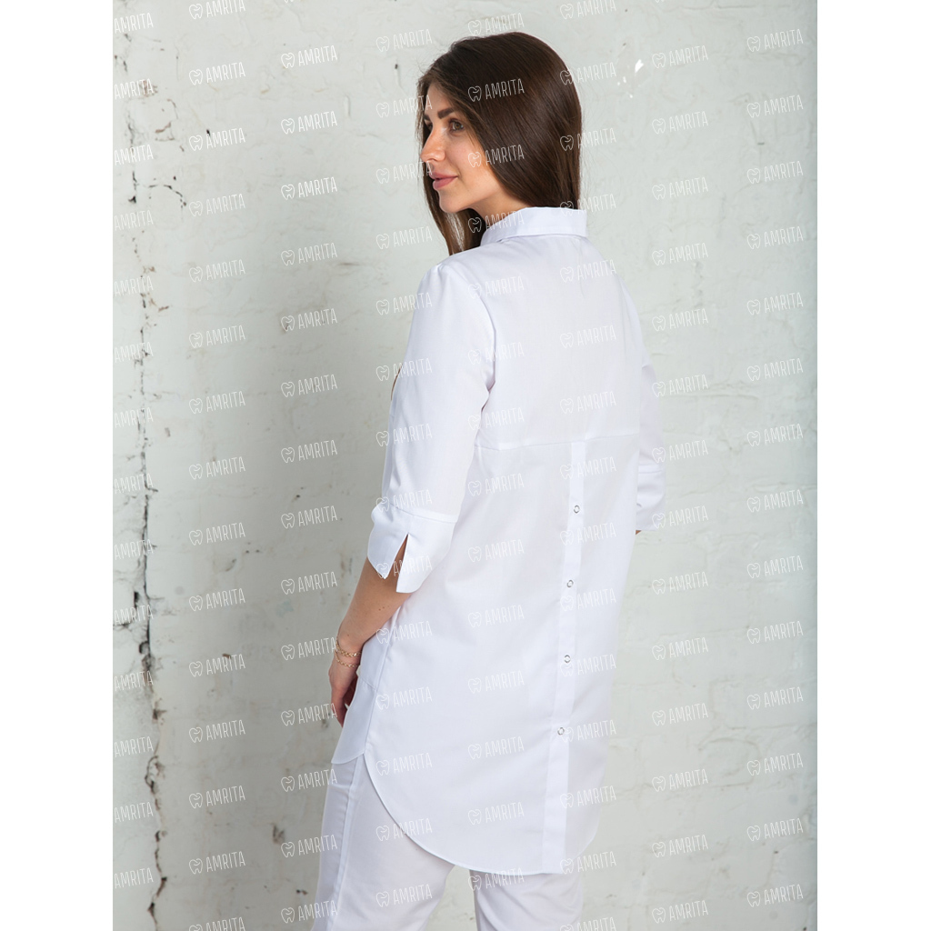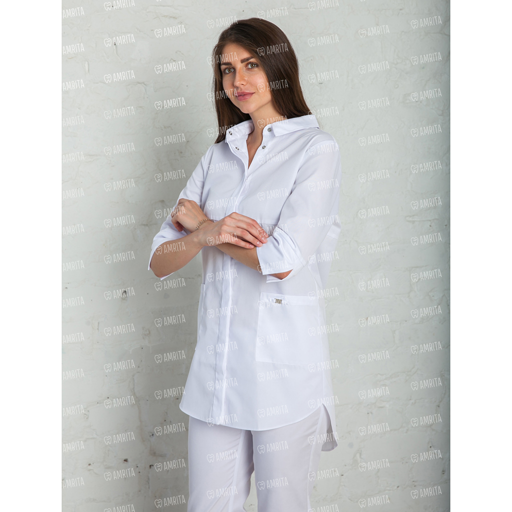Изящный блузон "Берта" от White Wears с удлиненной задней полочкой и рукавами ¾ позволит выглядеть гармонично и произвести положительное впечатление на нового пациента. Модель свободного кроя, застегивается спереди на металлические кнопки. Для нужных мелочей предусмотрены два накладных вместительных кармана. Этот блузон станет вашей любимой вещью! Сочетайте его с брюками или юбкой, меняя образы. Помимо дизайна, преимуществом нашей модели является материал, из которого она выполнена - основная ткань: сатори (50% хлопок, 50% полиэфир). Это обеспечивает ее износоустойчивость при стирке и дезинфекции.
