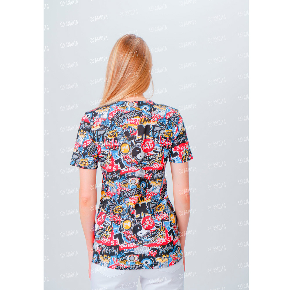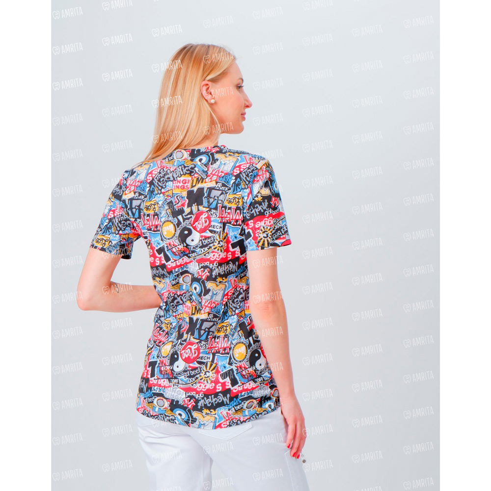 Женская медицинская блуза "Витерра" с веселым ярким принтом имеет полуприлегающий силуэт с удлиненной спинкой, V-образный вырез и короткий рукав. Модель дополнена двумя боковыми карманами